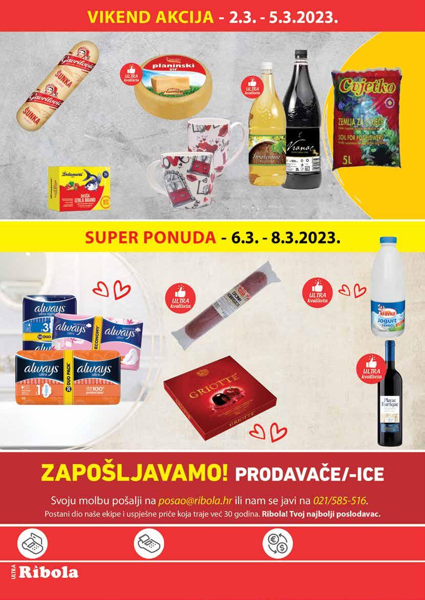 PLAĆANJA KARTICAMA Kartice koje prihvaćamo: Visa, Maestro, Master Card, Diners IZDAVANJE R-1 RAČUNA Na svakoj blagajni može Vam se izdati R-1 račun. DCC – KARTIČNO PLAĆANJE ZA STRANCE U NJIHOVOJ MATIČNOJ VALUTI Klijent bira kojom valutom će plaćati. Sve cijene su maloprodajne (uračunat PDV). Ponuda iz kataloga vrijedi isključivo u prodavaonicama Ribola u periodu od 2.3. - 8.3.2023. ili do isteka zaliha. *Cijene iskazane na polici su umanjene za navedeni postotak. Zbog ograničenosti prostora, sve akcije možda nisu dostupne u svim prodavaonicama Ribola. Fotografije artikala ne moraju odgovarati stvarnom izgledu proizvoda. Ne odgovaramo za tiskarske pogreške. Hiper – ponuda je dostupna u hipermarketu