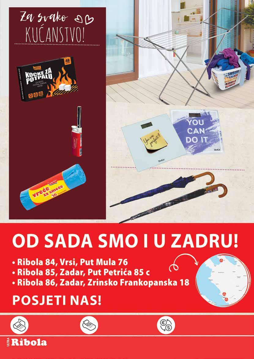 PLAĆANJA KARTICAMA Kartice koje prihvaćamo: Visa, Maestro, Master Card, Diners IZDAVANJE R-1 RAČUNA Na svakoj blagajni može Vam se izdati R-1 račun. DCC – KARTIČNO PLAĆANJE ZA STRANCE U NJIHOVOJ MATIČNOJ VALUTI Klijent bira kojom valutom će plaćati. Sve cijene su maloprodajne (uračunat PDV). Ponuda iz kataloga vrijedi isključivo u prodavaonicama Ribola u periodu od 5.1. - 11.1.2023. ili do isteka zaliha. *Cijene iskazane na polici su umanjene za navedeni postotak. Zbog ograničenosti prostora, sve akcije možda nisu dostupne u svim prodavaonicama Ribola. Fotografije artikala ne moraju odgovarati stvarnom izgledu proizvoda. Ne odgovaramo za tiskarske pogreške. Hiper – ponuda je dostupna u hipermarketu Ribola. Super – ponuda je dostupna u supermarketu Ribola. Prema odluci Vijeća Europske unije 1 € = 7,53450 kn. Ribola prihvaća i provodi načela etičkog kodeksa. -28% 0,93 €/6,98 kn 066 4 99 ULTRA PLUS Kocke za potpalu 48 kom -50% 1,32 €/9,98 kn 066 4 99 ULTRA PLUS Upaljač 1 kom -29% 1,13 €/8,48 kn 080 5 99 ULTRA PLUS Vreće za smeće • 50x65 cm 20 kom Digitalna osobna vaga 1 kom -30% 17,12 €/128,98 kn 11 94 8999 -24% 10,62 €/79,98 kn 796 59 99 Sušilo za robu • duljina za sušenje 18 m 1 kom -28% 7,43 €/55,98 kn 531 39 99 Kišobran maxi automatik 1 kom ULTRA kvaliteta ULTRA kvaliteta ULTRA kvaliteta hiper super hiper hiper