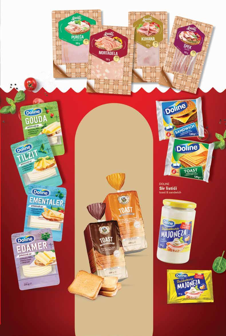 GUŠTI Kuhana šunka, Mortadela, Pureća dimljena šunka ili Dimljeni špek polutrajni proizvod TIPS & TRICKS 0 66 € 4.97 kn 1 kg = 7,76 € / 58,47 kn 85 g DOLINE Majoneza delikatesna DOLINE Majoneza delikatesna 1 06 € 7.99 kn 1 kg = 8,83 € / 66,58 kn 120 g 3 18 € 23.96 kn 1 kg = 5,13 € / 38,65 kn 620 g Brzi snack! Dodaj svježu salatu u svoj omiljeni tost i oduševi se našim kreativnim i brzim toast idejama za najbolji snack doživljaj. 1 59 € 11.98 kn 100 - 150 g 1 kg = 10,60 - 15,90 € / 79,87 - 119,80 kn 1 72 € 12.96 kn 1 kg = 11,47 € / 86,40 kn 150 g DOLINE Sir Edamer, Ementaler, Gouda ili Tilzit rezani MULINI Toast kruh bijeli ili integralni 400 g 1 33 € 10.02 kn Štedi više! Plati manje! 50% sniženoSuper svježa prilika!Već od VEĆ OD Fotografije proizvoda ne moraju u potpunosti odgovarati stvarnom izgledu proizvoda. Kupnja je moguća samo u količinama primjerenim za kućanstvo. Sve navedene cijene izražene su u kunama i eurima s PDV-om. Fiksni tečaj konverzije €/kn: 7,53450. Ne odgovaramo za tiskarske pogreške. 19