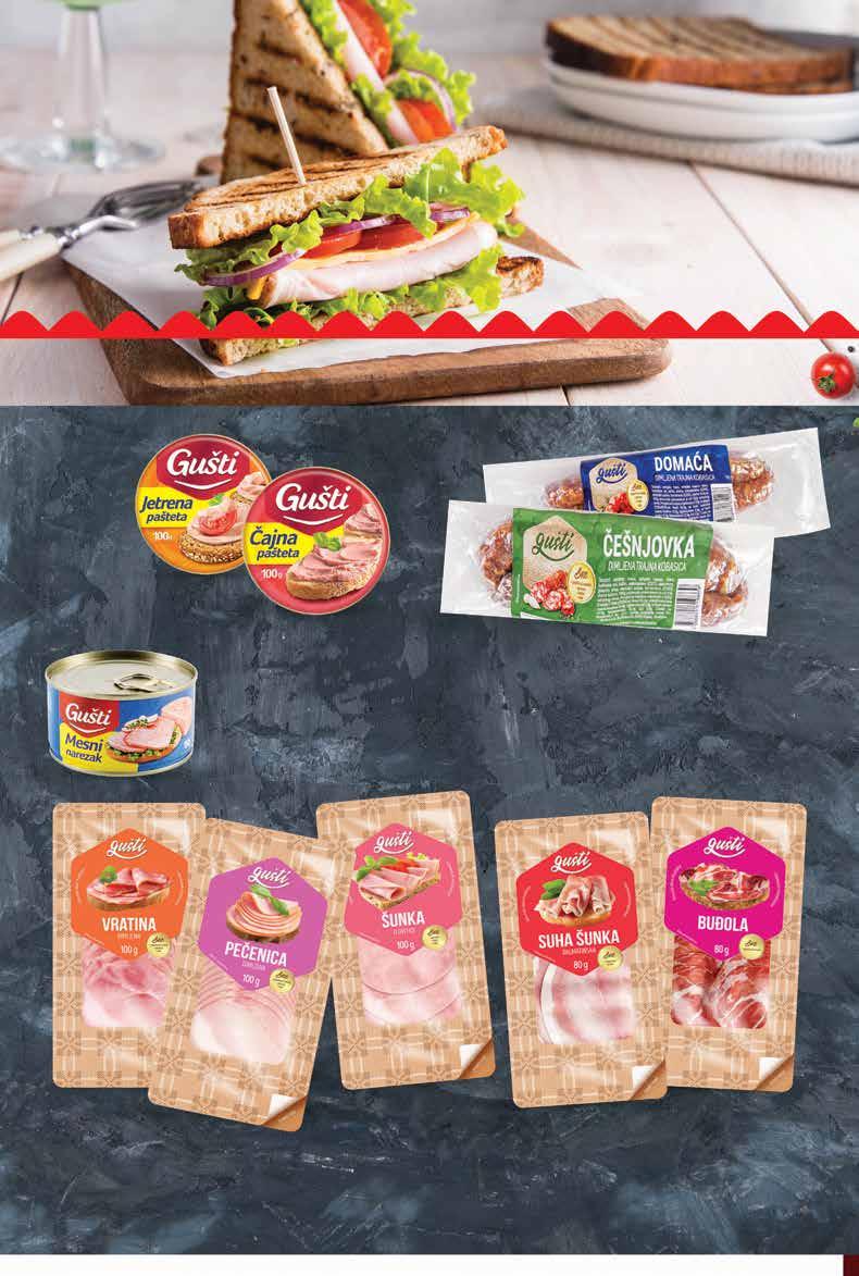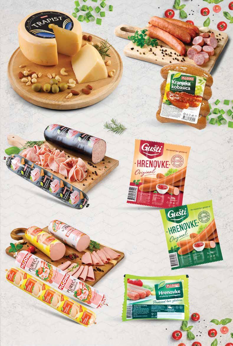 Gurmanski gušt za svaki trenutak! ODUŠEVITE SVOJE NEPCE S NOVIM OKUSIMA IZ NAŠEG GURMANSKOG ASORTIMANA GUŠTI Češnjovka ili Domaća kobasica trajni proizvod GUŠTI Dimljena vratina, Dimljena pečenica ili Šunka u ovitku narezak polutrajni proizvod GUŠTI Pašteta čajna ili jetrena GUŠTI Mesni narezak 1 19 € 8.97 kn 1 kg = 11,90 € / 89,70 kn 100 g 0 69 € 5.20 kn 1 kg = 6,90 € / 52,00 kn 100 g 1 19 € 8.97 kn 1 kg = 7,93 € / 59,80 kn 150 g 2 79 € 21.02 kn 200 g 1 kg = 13,95 € / 105,10 kn GUŠTI Dalmatinska suha šunka ili buđola trajni proizvod 1 99 € 14.99 kn 1 kg = 24,88 € / 187,38 kn 80 g R BNE MARKE naše Fotografije proizvoda ne moraju u potpunosti odgovarati stvarnom izgledu proizvoda. Kupnja je moguća samo u količinama primjerenim za kućanstvo. Sve navedene cijene izražene su u kunama i eurima s PDV-om. Fiksni tečaj konverzije €/kn: 7,53450. Ne odgovaramo za tiskarske pogreške. 18