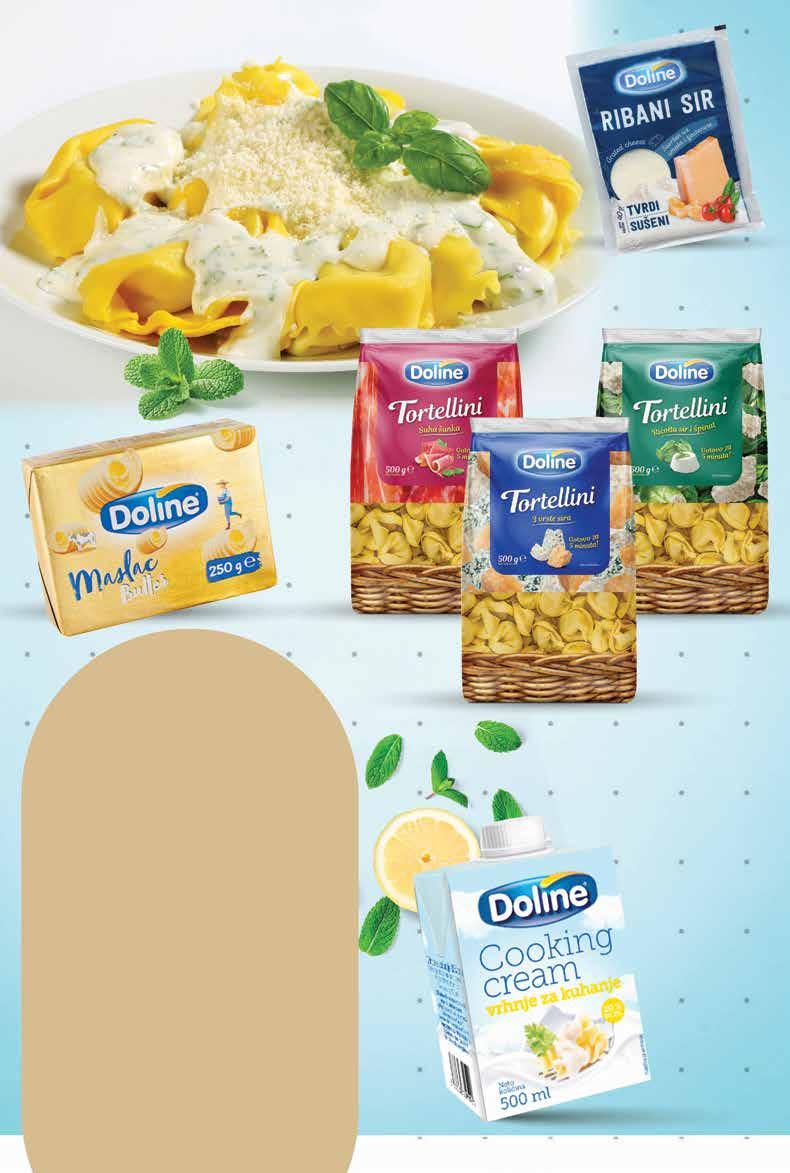 1 59 € 11.98 kn 500 g 1 kg = 3,18 € / 23,96 kn 1 85 € 13.94 kn 1 l = 3,70 € / 27,88 kn 500 ml DOLINE Maslac 82% m.m. DOLINE Sir ribani za vaš kompletan obrok za 4 osobe sastojci 500 g tortelina . 100