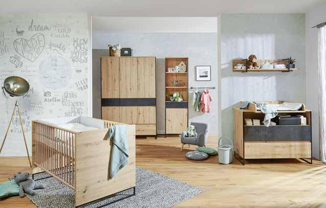 6: Dječja soba Yunai, dekor hrast, boja: antracit/hrast. Dječji krevetić, podesivo po visini, mogućnost pretvorbe u krevet za mlade, 70x140 cm. Komoda za previjanje, s uključenim nastavkom za previjanje, 120x106x78 cm. 140x209x55 cm. Madrac Silbermond, jezgra od hladno lijevane pjene, optimalna ventilacija, mikroporozno, navlaka od kombinacije poliesterskih vlakana i pamuka skidiva i periva do 60°C, 60x120 cm 143,99 119,99 € 1.084,89 904,06 kn; cm 156,99 129,99 € 1.182,84 979,41 kn (02410046/01-03;68690078/01-02)