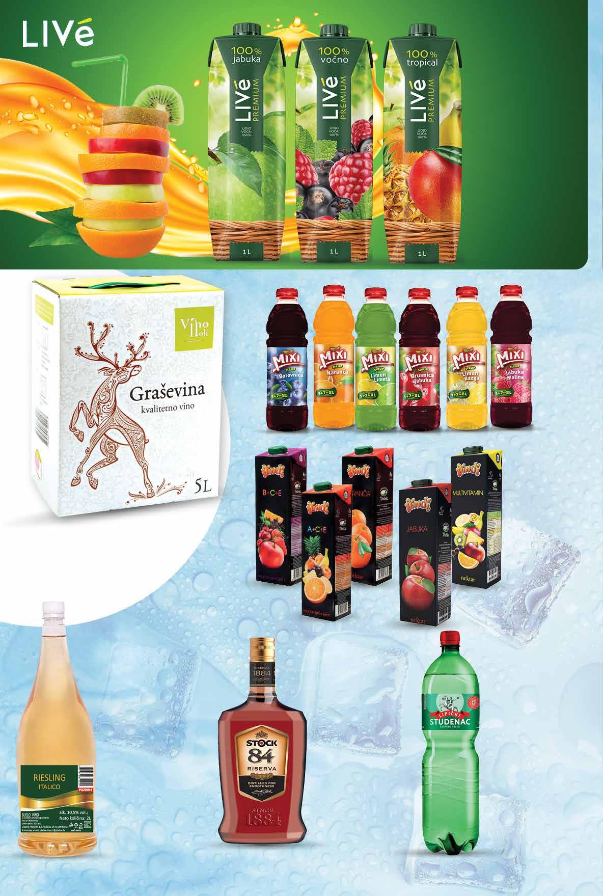 -00% 00,99 00,99 VEĆ OD 699 kn 0,93 € STUDENAC Mineralna voda gazirana 1,5 l 1 l = 2,66 kn 1 l = 0,35 € 00,99 4999 kn 6,63 € VINDI Voćni sok razne vrste 1 lVINO ILOK Graševina bag in box 5 l 1 l = 10,00 kn 1 l = 1,33 € LIVE Sok premium 100% odabrane vrste 1 l MIXI Sirup razne vrste 1 l STOCK 84 Brandy udio alkohola 38% 1 l RIESLING Vino bijelo Makedonija 2 l 1 l = 8,00 kn 1 l = 1,06 € 00,99 1599 kn 2,12 € 00,99 1399 kn 1,86 € 00,99 8999 kn 11,94 € 00,99 399 kn 0,53 € 00,99 799 kn 1,06 € 5 l 2 l Fotografije proizvoda ne moraju u potpunosti odgovarati stvarnom izgledu proizvoda. Kupnja je moguća samo u količinama primjerenim za kućanstvo. Sve navedene cijene izražene su u kunama i eurima s PDV-om. Fiksni tečaj konverzije €/kn: 7,53450. Ne odgovaramo za tiskarske pogreške.30