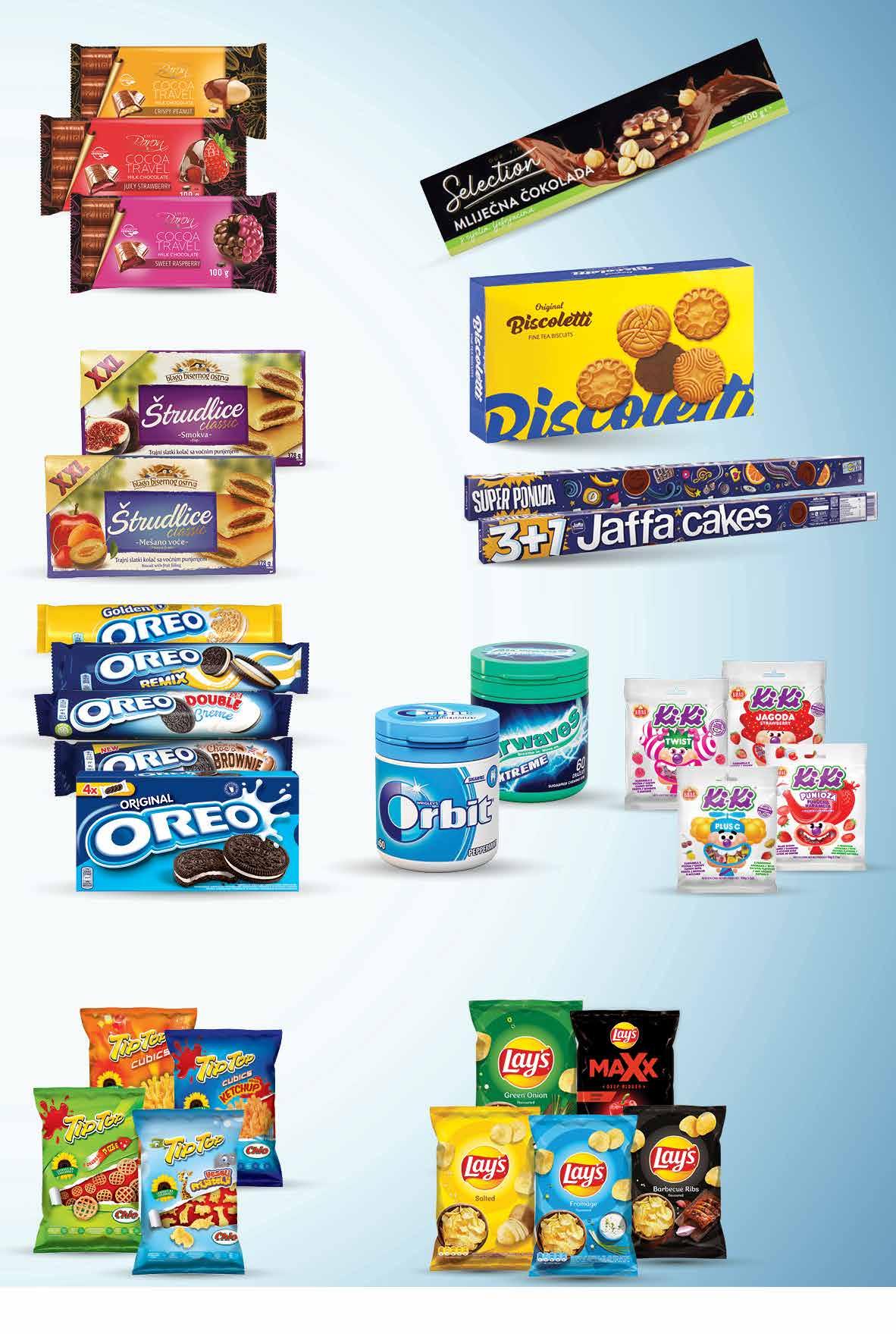 JAFFA Cakes biskvit sa želeom 3+1 gratis 600 g 1 kg = 44,42 kn 1 kg = 5,89 € OREO Keks razne vrste 154 - 176 g 1 kg = 56,76 - 64,87 kn 1 kg = 7,56 - 8,64 € CHIO Tip Top odabrane vrste 40 - 50 g 1 kg = 99,80 - 110,89 kn 1 kg = 13,20 - 14,67 € LAY’S Čips odabrane vrste 130 - 140 g 1 kg = 61,06 - 84,54 kn 1 kg = 8,11 - 11,23 € KIKI Bomboni Plus ili voćna karamela 90 - 100 g 1 kg = 59,90 - 66,60 kn 1 kg = 8,00 - 11,11 € 1099 kn 1,46 € 599 kn 0,80 € 00,99 1999 kn 2,65 € 00,99 1999 kn 2,65 € 999 kn 1,33 € 899 kn 1,19 € 499 kn 0,66 € SELECTION Čokolada cijeli lješnjak 200 g 1 kg = 74,95 kn 1 kg = 9,95 € ORBIT ILI AIRWAVES Dražeje u bočici odabrane vrste 67 - 84 g 1 kg = 229,77 - 237,98 kn 1 kg = 30,46 - 31,55 € Štrudla Smokva ili miješano voće XXL 378 g 1 kg = 23,78 kn 1 kg = 3,15 € BISCOLETTI Čajno pecivo s kakao preljevom 230 g 1 kg = 21,70 kn 1 kg = 2,87 € 499 kn 0,66 € BARON Čokolada kikiriki, jagoda ili malina 100 g 1 kg = 49,90 kn 1 kg = 6,60 € 00,99 499 kn 0,66 € 00,99 1499 kn 1,99 € Fotografije proizvoda ne moraju u potpunosti odgovarati stvarnom izgledu proizvoda. Kupnja je moguća samo u količinama primjerenim za kućanstvo. Sve navedene cijene izražene su u kunama i eurima s PDV-om. Fiksni tečaj konverzije €/kn: 7,53450. Ne odgovaramo za tiskarske pogreške. 29