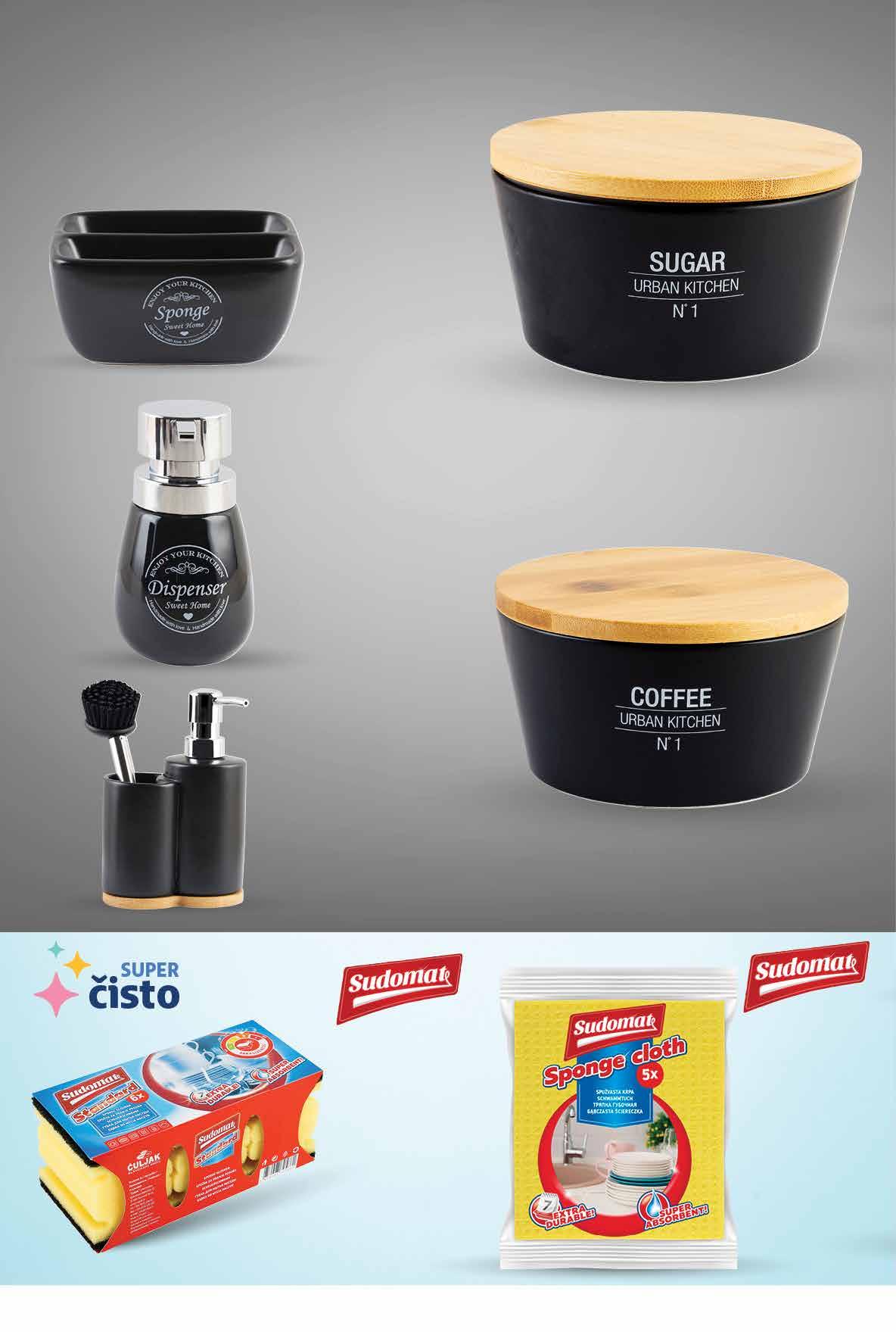 SUDOMAT Spužvasta krpa • služi za čišćenje svih vrsta površina u kućanstvu • dugotrajna i ima veliku moć upijanja • 5 komada SUDOMAT Abrazivna spužvica • za pranje posuđa • 6 komada u pakiranju 00,99 799 kn 1,06 € 00,99 699 kn 0,93 € Posuda za kuhinju • dimezije cca 13x10x6 cm Dozator za sapun • materijal: keramika Dozator za kavu • keramika sa bambus poklopcem Dozator za šećer • keramika+bambus poklopac Kuhaj sa stilom 00,99 3499 kn 4,64 € 00,99 3499 kn 4,64 € 00,99 2499 kn 3,32 € 00,99 1599 kn 2,12 € 00,99 3499 kn 4,64 € Doza za deterdžent + držač za četku za čišćenje • materijal: keramika 8×8×14 cm 11×6×18 cm 13,8×13,8×7,4 cm 13,8×13,8×7,4 cm Fotografije proizvoda ne moraju u potpunosti odgovarati stvarnom izgledu proizvoda. Kupnja je moguća samo u količinama primjerenim za kućanstvo. Sve navedene cijene izražene su u kunama i eurima s PDV-om. Fiksni tečaj konverzije €/kn: 7,53450. Ne odgovaramo za tiskarske pogreške.42