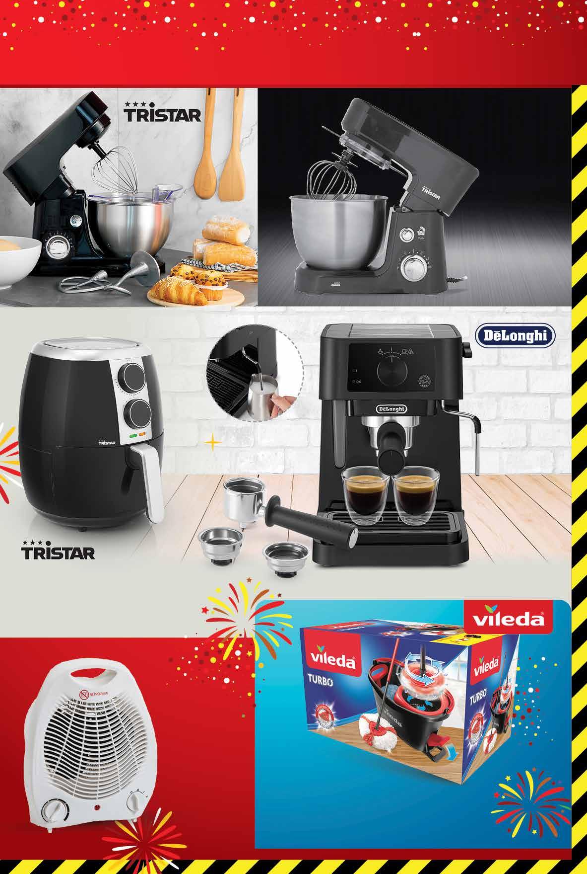 9999 kn 13,27 € VILEDA Set za čišćenje podova • teleskopska drška s mogućnošću vješanja • nastavak za čišćenje sa okretnim zglobom za čišćenje teže dostupnih mjesta • kanta s cjedilom sa otvorom na prednjoj strani za lakše i jednostavnije izlijevanje vode Kalorifer • zaštita od pregrijavanja • indikatorska lampica • regulator postavke topline DELONGHI Espresso aparat za kavu • 15 bara • bojler i pjenilica za mlijeko od nehrđajućeg čelika TRISTAR Friteza na vrući zrak • temperatura 80-200 °C TRISTAR Robot mikser 6 x 75,00 kn 6 x 9,95 € 700 W 3,5 ml • prozirna zaštita protiv prskanja, pjenjača za jaja, kuka za tijesto i ravna miješalica za sva tijesta • planetarni pokreti miješanja • izdržljiv kuhinjski stroj s visokokvalitetnim plastičnim kućištem i metalnim zupčanicima • lako se čisti zahvaljujući dijelovima perivim u perilici posuđa 19999 kn 26,54 € 44999 kn 59,72 € 6 x 110,00 kn 6 x 14,60 € 65999 kn 87,60 € timer do 30 minuta 6 x 81,67 kn 6 x 10,84 € 48999 kn 65,03 € SUPER PONUDA SAMO U VELIKA GORICA SUPERMARKETU 2000 W 1100 W1500 W 3,5 l 9Fotografije proizvoda ne moraju u potpunosti odgovarati stvarnom iz gledu proizvoda. Kupnja je moguća samo u količinama primjerenim za kućanstvo. Sve navedene cijene izražene su u kunama i eurima s PDV-om. Fiksni tečaj konverzije €/kn: 7,53450. Ne odgovaramo za tiskarske pogreške.