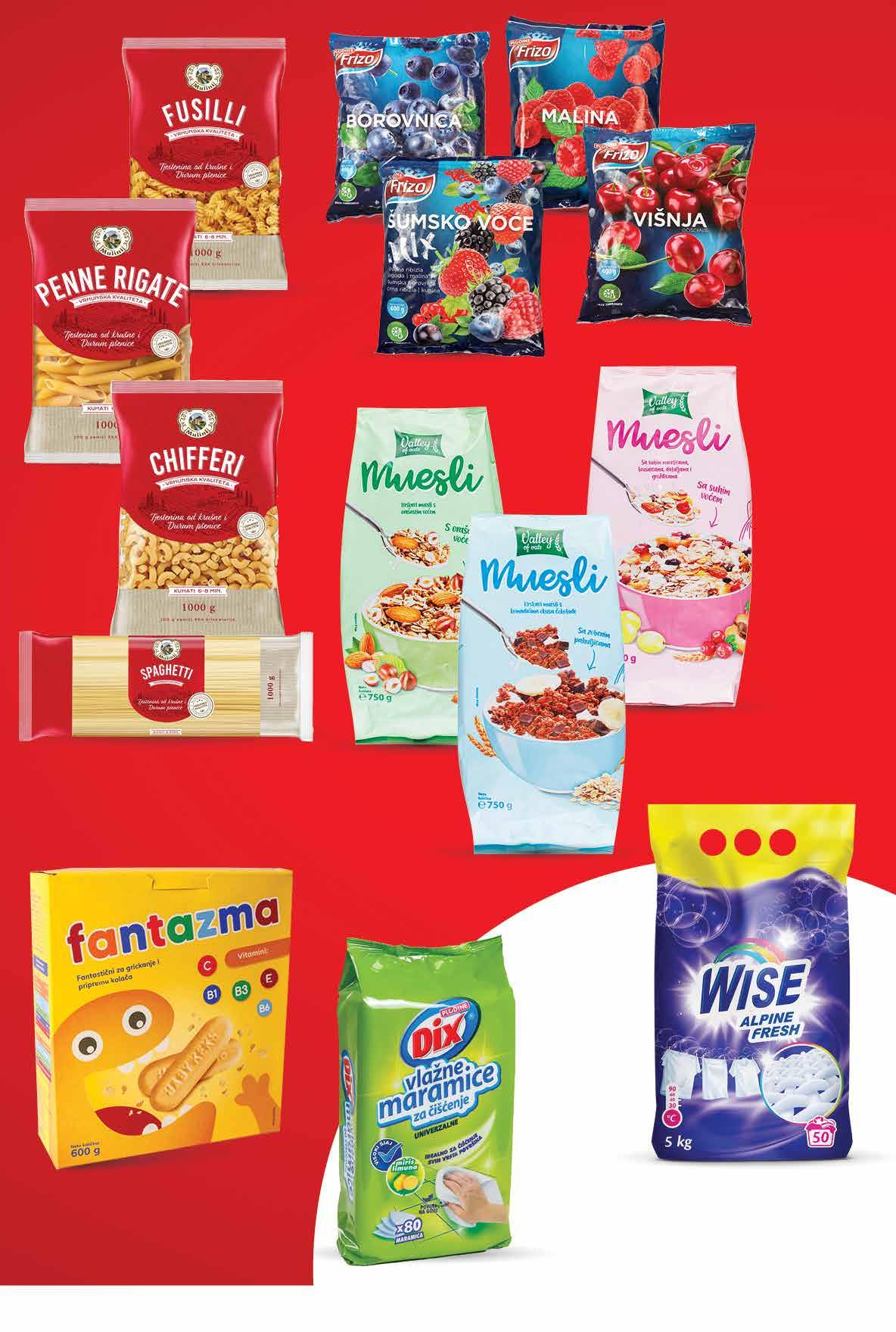 smrznuto VALLEY OF OATS Muesli razne vrste 750 g 1 kg = 26,65 kn 1 kg = 3,53 € FANTAZMA Keks Prhki 600 g 1 kg = 29,98 kn 1 kg = 3,98 € -00% 00,99 00,99 SUPER PONUDA! 3999 kn 5,31 € 00,99 999 kn 1,33 € WISE Deterdžent za rublje Alpine fresh 5 kg 1 kg = 8,00 kn 1 kg = 1,06 € DIX Univerzalne vlažne maramice za čišćenje pakiranje od 80 komada 1 kom = 0,12 kn 1 kom = 0,02 € MULINI Tjestenina razne vrste 1 kg 00,99 1999 kn 2,65 € 1799 kn 2,39 € 1099 kn 1,46 € FRIZO Malina, Višnja, Borovnica ili Šumsko voće 400 g odabrani proizvodi -20% 1 kg Fotografije proizvoda ne moraju u potpunosti odgovarati stvarnom izgledu proizvoda. Kupnja je moguća samo u količinama primjerenim za kućanstvo. Sve navedene cijene izražene su u kunama i eurima s PDV-om. Fiksni tečaj konverzije €/kn: 7,53450. Ne odgovaramo za tiskarske pogreške. 21