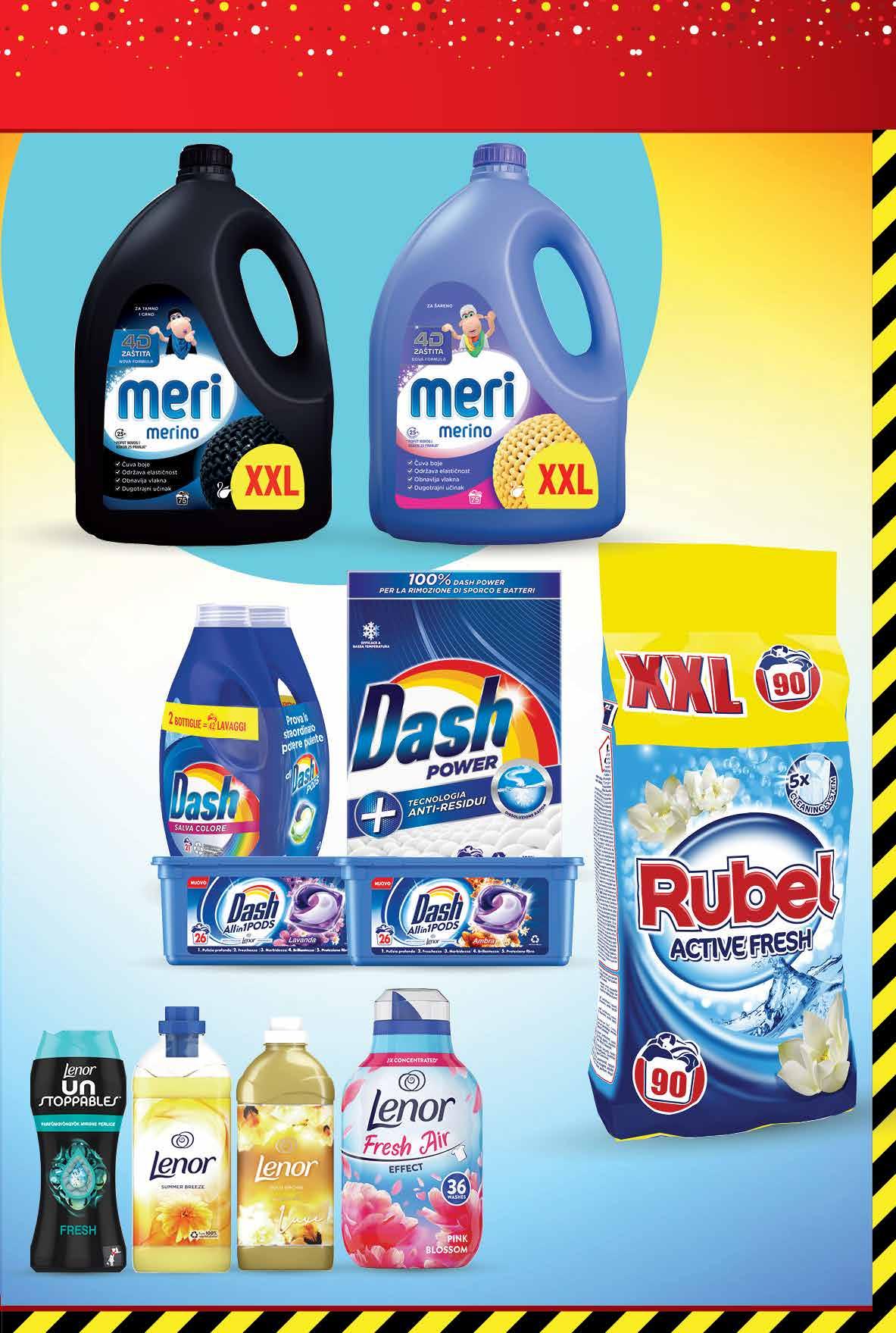 MERI MERINO Deterdžent za rublje razne vrste 4,5 l 1 l = 8,89 kn 1 l = 1,18 € DASH Deterdžent za rublje 2,82 kg, 2,31 l ili 26 komada 1 kg = 15,95 kn 1 kg = 2,12 € 1 l = 19,48 kn 1 l = 2,59 € 1 kom = 1,73 kn 1 kom = 0,23 € RUBEL Deterdžent za rublje Aktive fresh 9 kg 1 kg = 6,67 kn 1 kg = 0,88 € LENOR odabrani proizvodi -50% 3999 kn 5,31 € 4499 kn 5,97 € 5999 kn 7,96 € SUPER PONUDA SAMO U VELIKA GORICA SUPERMARKETU 9 kg 7Fotografije proizvoda ne moraju u potpunosti odgovarati stvarnom iz gledu proizvoda. Kupnja je moguća samo u količinama primjerenim za kućanstvo. Sve navedene cijene izražene su u kunama i eurima s PDV-om. Fiksni tečaj konverzije €/kn: 7,53450. Ne odgovaramo za tiskarske pogreške.