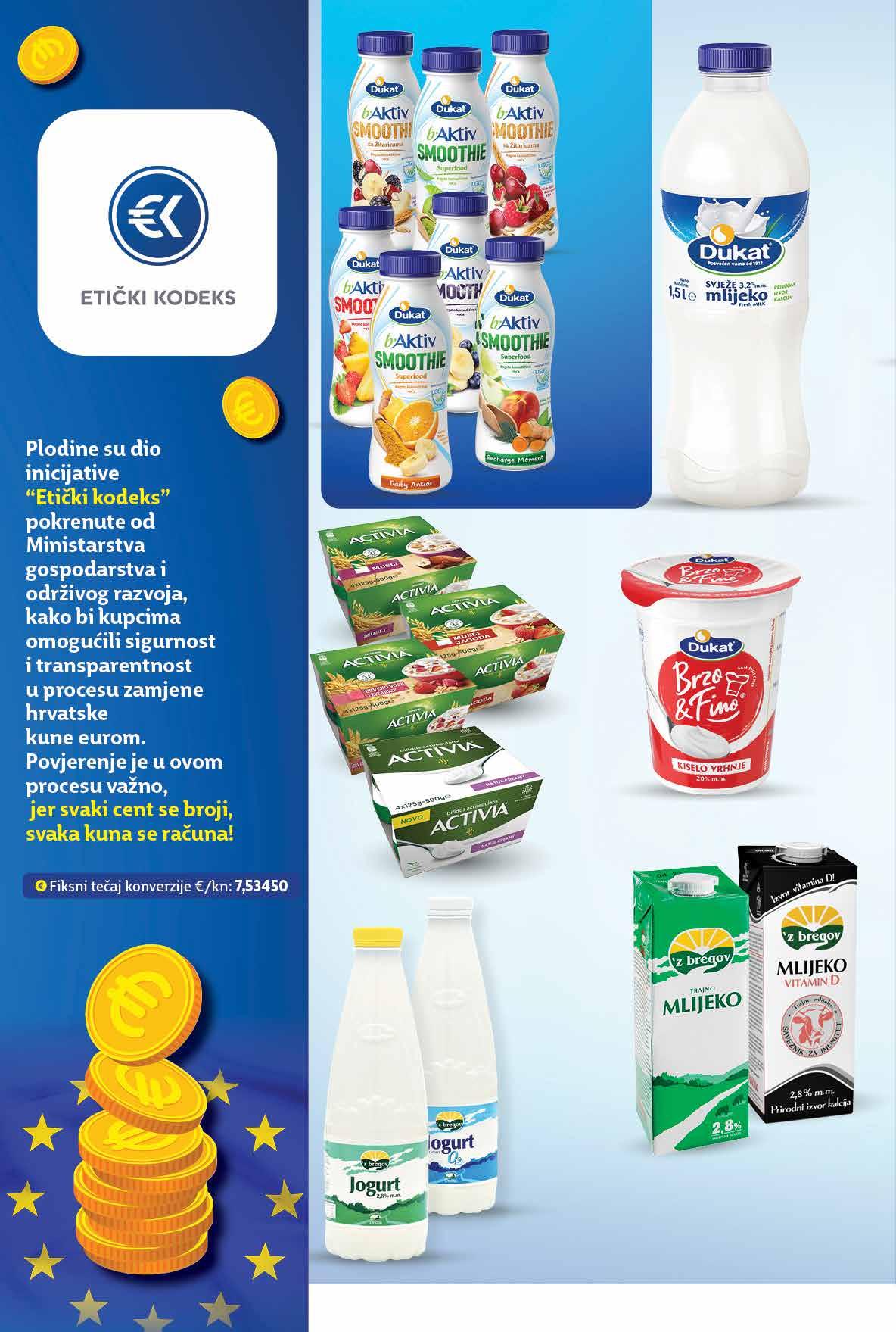 `Z BREGOV Trajno mlijeko obično ili s dodatkom vitamina D 2,8% m.m. 1 l `Z BREGOV Tekući jogurt 2,8% ili 0,9% m.m. 1 kg B.AKTIV Smoothie jogurt LGG razni okusi 1,5% m.m. 330 g 1 kg = 27,24 kn 1 kg = 3,61 € DANONE Activia Jogurt razne vrste 4x 125 g 1 kg = 25,98 kn 1 kg = 3,44 € DUKAT Svježe mlijeko 3,2% m.m. 1,5 l 1 l = 8,32 kn 1 l = 1,11 € 00,99 1249 kn 1,66 € 00,99 1299 kn 1,72 € 00,99 899 kn 1,19 € 00,99 1299 kn 1,72 € 00,99 549 kn 0,73 € DUKAT Kiselo vrhnje 20% m.m. 200 g 1 kg = 27,45 kn 1 kg = 3,65 € 00,99 738 kn 0,98 € 1,5 l Fotografije proizvoda ne moraju u potpunosti odgovarati stvarnom izgledu proizvoda. Kupnja je moguća samo u količinama primjerenim za kućanstvo. Sve navedene cijene izražene su u kunama i eurima s PDV-om. Fiksni tečaj konverzije €/kn: 7,53450. Ne odgovaramo za tiskarske pogreške.24