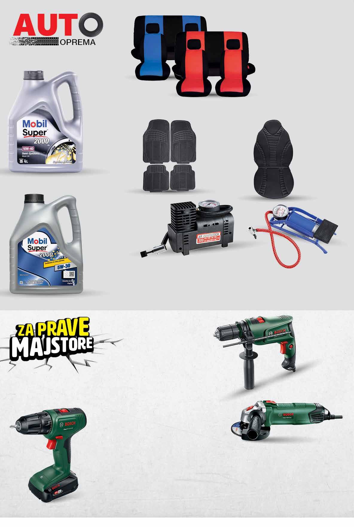 00,99 3499 kn 4,64 € 00,99 9499 kn 12,61 € 00,99 4999 kn 6,63 € 00,99 5599 kn 7,43 € 35999 kn 47,78 € 00,99 9999 kn 13,27 € 00,99 14499 kn 19,24 € 00,99 17999 kn 23,89 € MOBIL SUPER Polusintetičko motorno ulje • 10W40 4 l 1 l = 36,25 kn 1 l = 4,81 € Auto navlake • 6 dijelova • boja: crvena, siva, plava • materijal: polister • set sadrži: 2 navlake prednje sjedište, 1 donji dio i 1 gornji dio zadnjeg sjedišta i 2 navlake naslona za glavu MOBIL SUPER Polusintetičko motorno ulje 5W-30 5 l 1 l = 36,00 kn 1 l = 4,78 € Auto tepisi • 4 komada • materijal PVC • prikladni za većinu vozila • učinkovito zadržavaju vlagu i prljavštinu Zračni kompresor • SET-10B • snaga: 12 V • tlak zraka: 250/300 PSI • cilindar: 16 mm • dužina visokotlačnog crijeva: 3 m • pribor: 2 adaptera za mlaznice i jedna sportska igla Nožna pumpa • dimenzije 55 x 100 mm • namjenjena za napuhavanje guma • fleksibilno crijevo 6 x 60,00 kn 6 x 7,96 € 00,99 51499 kn 68,35 € 6 x 85,83 kn 6 x 11,39 € 00,99 39999 kn 53,09 € 6 x 66,67 kn 6 x 8,85 € BOSCH Udarna bušilica • jamstvo 2+1 godina 4 × Tehnički podatci 750 Wsnaga broj okretaja u praznom hodu Ø brusne ploče 115 mm 12,000 min-1 Tehnički podatci 600EasyImpact izlazna snaga promjer bušenja brzina praznog hoda broj udaraca 600 W 45.000 min-1 1,2 Nm 370 W u betonu/čeliku/drvetu 12/10/25 mm 0 - 3.000 min-1 nominalna snaga nazivni okretni moment