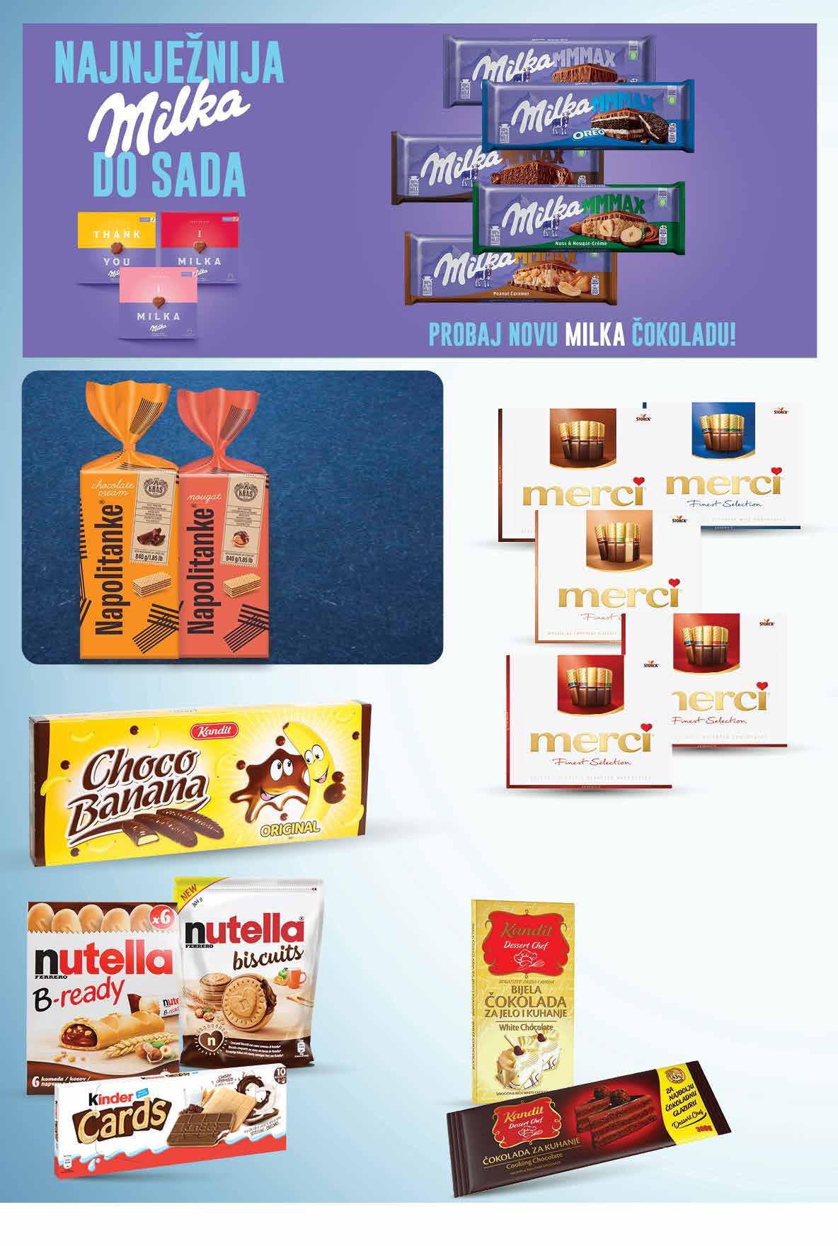KINDER I FERRERO Keksi odabrani proizvodi -20% KANDIT Choco banana 280 g 1 kg = 49,96 kn 1 kg = 6,64 € KANDIT Čokolada za kuhanje Dessert chef bijela ili tamna 200 - 300 g 1 kg = 43,30 - 64,95 kn 1 kg = 5,73 - 8,60 € MERCI Bombonijera ODABRANE vrste 210 - 250 g 1 kg = 115,96 - 138,05 kn 1 kg = 15,40 - 18,33 € KRAŠ Napolitanke čokoladna ili nougat krema 840 g 1 kg = 28,56 kn 1 kg = 3,79 € 00,99 2399 kn 3,18 € 00,99 2899 kn 3,85 € MILKA Praline odabrane vrste 110 g 1 kg = 163,55 kn 1 kg = 21,73 € 1399 kn 1,86 € 1299 kn 1,72 € 00,99 1899 kn 2,52 € MILKA Čokolada odabrane vrste 270 - 300 g 1 kg = 63,30- 70,33 kn 1 kg = 8,40 - 9,33 € 1799 kn 2,39 € Fotografije proizvoda ne moraju u potpunosti odgovarati stvarnom izgledu proizvoda. Kupnja je moguća samo u količinama primjerenim za kućanstvo. Sve navedene cijene izražene su u kunama i eurima s PDV-om. Fiksni tečaj konverzije €/kn: 7,53450. Ne odgovaramo za tiskarske pogreške.28