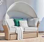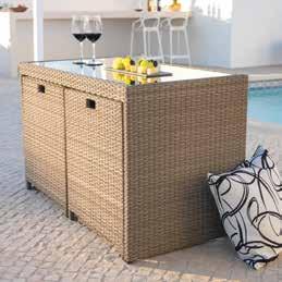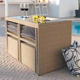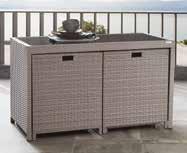 Posebnost garniture Cabrio je u tome što se lako spaja u veliku kutnu garnituru ili se odvaja u dva komotna trosjeda čime ćete udobnije objedovati. Tu je i sklopiva tenda koja će vas štiti od jakog sunca a dva taburea su zgodno rješenje za ponekog zalutalog gosta. Aluminijska konstrukcija crne boje idealno se slaže s finim svijetlo sivim tonovima tende te jastuka za sjedenje i naslon uključenima u cijenu. Tkanina je izrađena od kombinacije poliesterskih vlakana i tekstilena. Ploča stola je od pjeskarenog kaljenog stakla tamno sive boje Cijela garnitura, sastavljena u kutnu ima ukupnu dimenziju š/d: 262x200 cm i sastoji se od: stola š/v/d: 150x65x90 cm nosivosti do 60 kg; trosjeda sa sklopivom tendom š/v/d: 188x64,5x72 cm nosivosti do 360 kg; trosjeda bez tende š/v/d: 200x72x64,5 cm nosivosti do 360 kg i dva taburea š/v/d: 40x32x40 nosivosti do 120 kg. Dekorativni jastučići uz nadoplatu. (06390007/09)