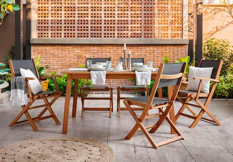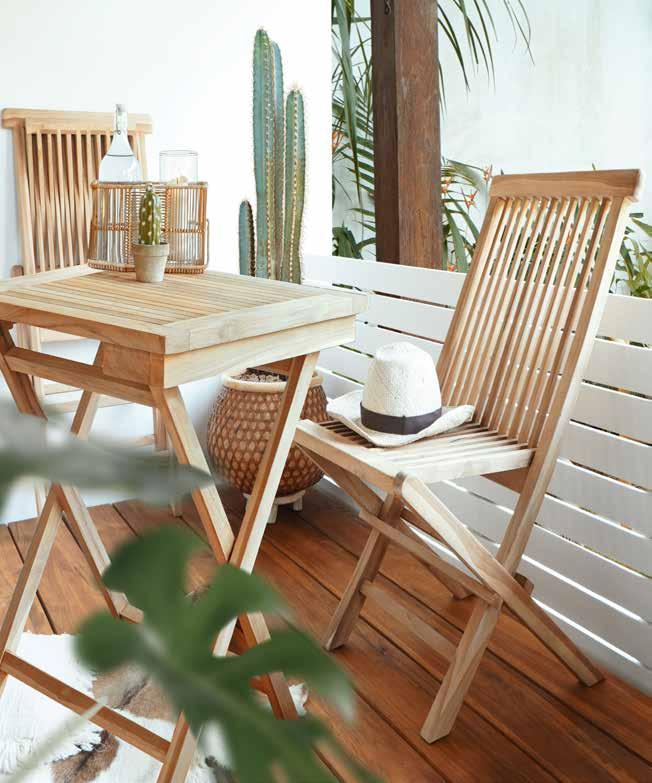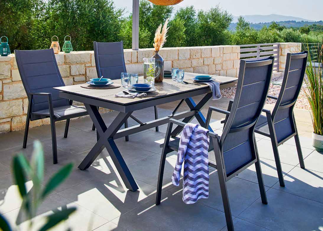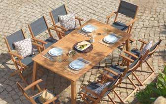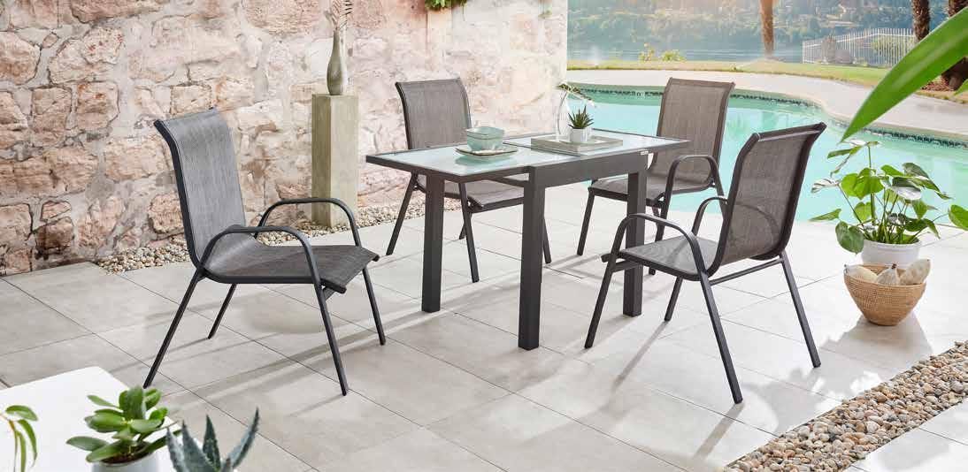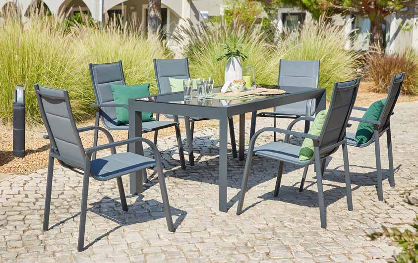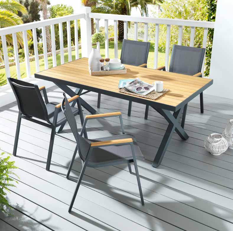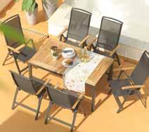 Plano je moderna vrtna garnitura koja će biti centralna figura svih vaših vrtnih zabava. Konstrukcija garniture je od aluminija antracit boje a toplinu i elegantan dojam osigurat će ploča stola od fsc tikovog drveta kao i detalji od tikovine na rukonaslonima stolica te udobno sjedište od antracit tekstilen tkanine. Garnitura se sastoji od elemenata koji su dostupni zasebno i time možete odabirati stil i broj stolica koji odgovara vašim potrebama. Složiva stolica, š/v/d: 58x91x70 cm, nosivosti do 130 kg. Sklopiva stolica, š/v/d: 63/116/60 cm, nosivosti do 120 kg. Razvlačni stol, preklopni uložak, š/v/d: 150-210x74x90 cm, nosivosti do 60 kg. (20530001/01,02,07)