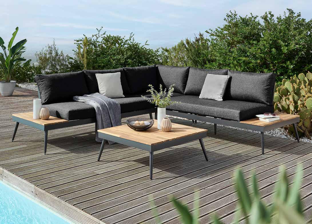 Kutna garnitura York, od plastificiranog aluminija i masivnog FSC drveta tikovine. Sastav: stolić š/v/d: 110x41x75 cm s praktičnim umetkom za hlađenje pića ili voća, maksimalne nosivosti 50 kg, dva dvosjeda pojedinačne dimenzije š/v/d: 143,5x61,5x81 cm, maksimalne nosivosti 240 kg/dvosjedu i kutnog elementa š/v/d: 81x61,5x81 cm nosivosti do 120 kg. Ukupna dimenzija kutne garniture je š/v/d: 224,5x61,5x224,5 cm. Jastuci za naslon i sjedenje te sivi dekorativni jastuci su od tekstilen tkanine i uključeni u cijenu. (29280020/01)