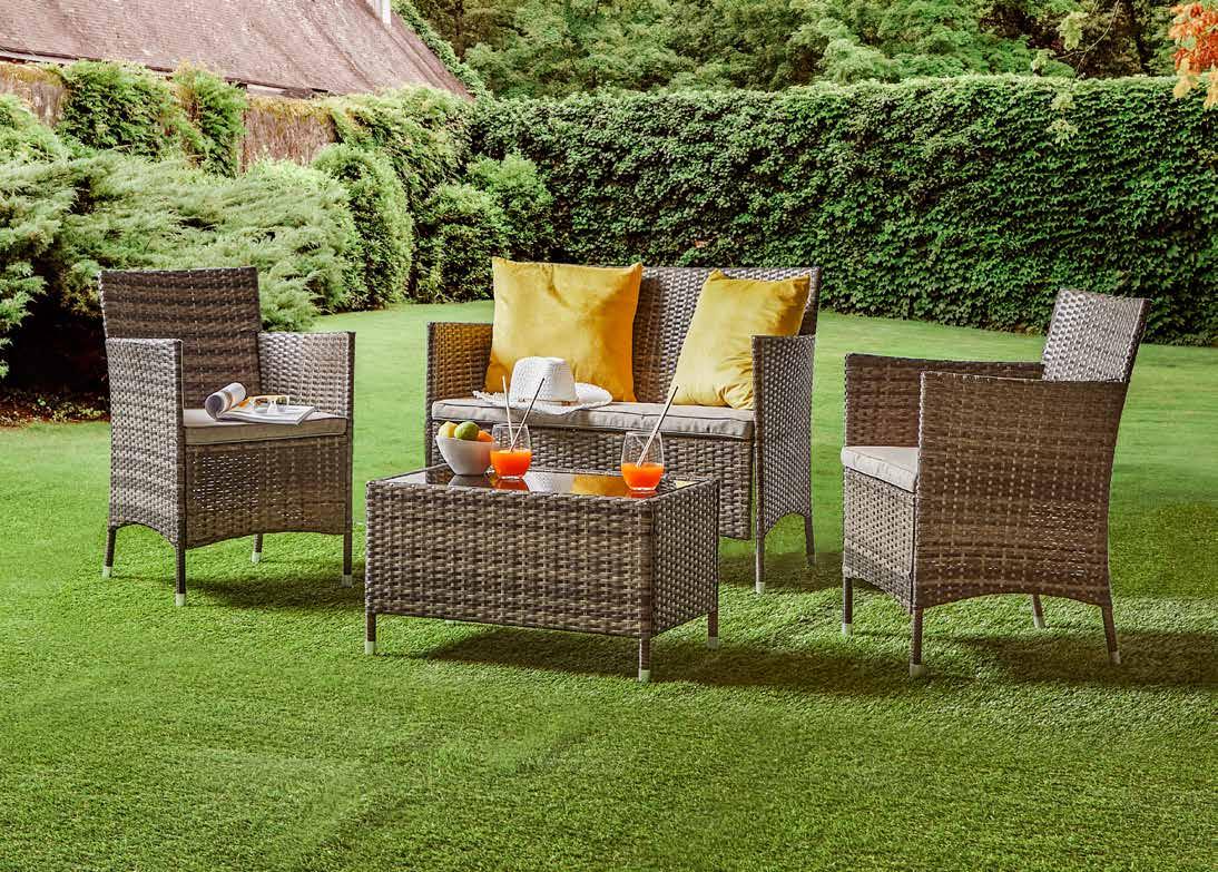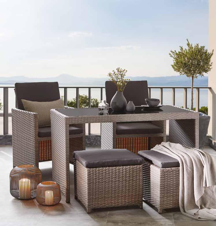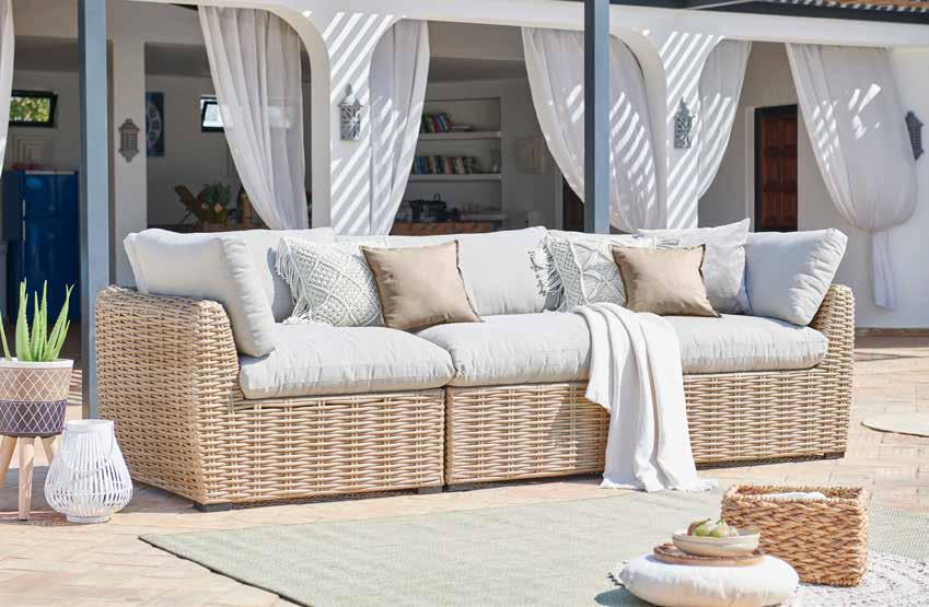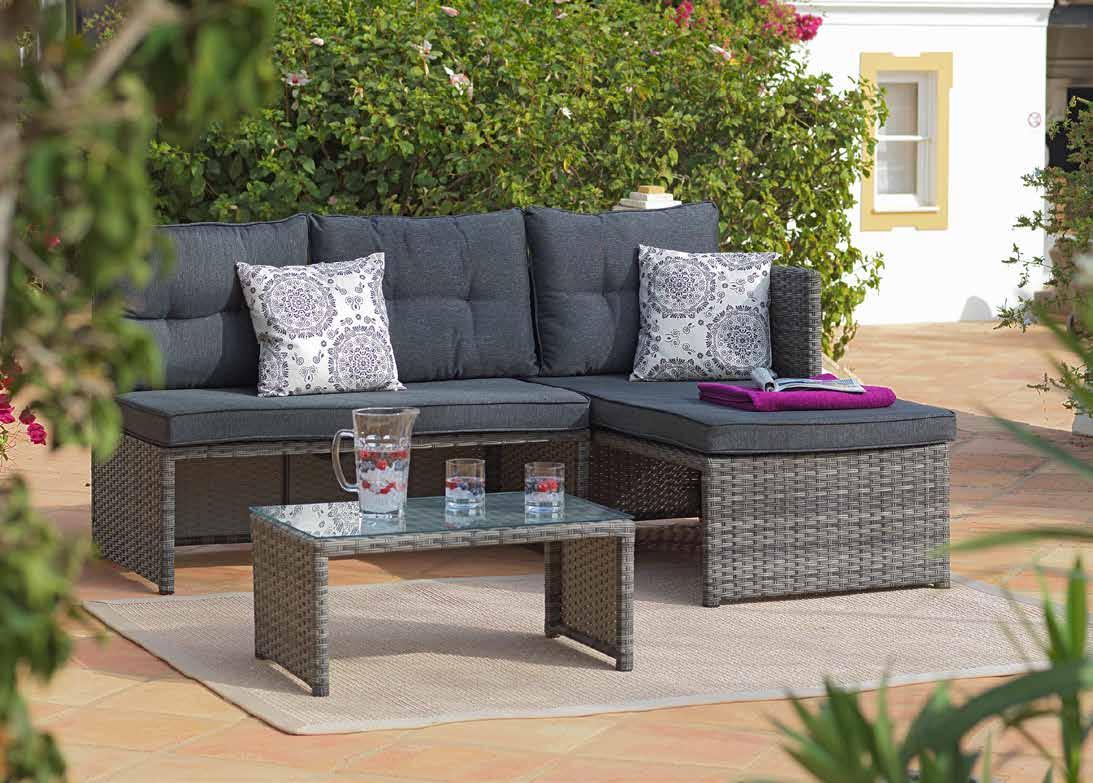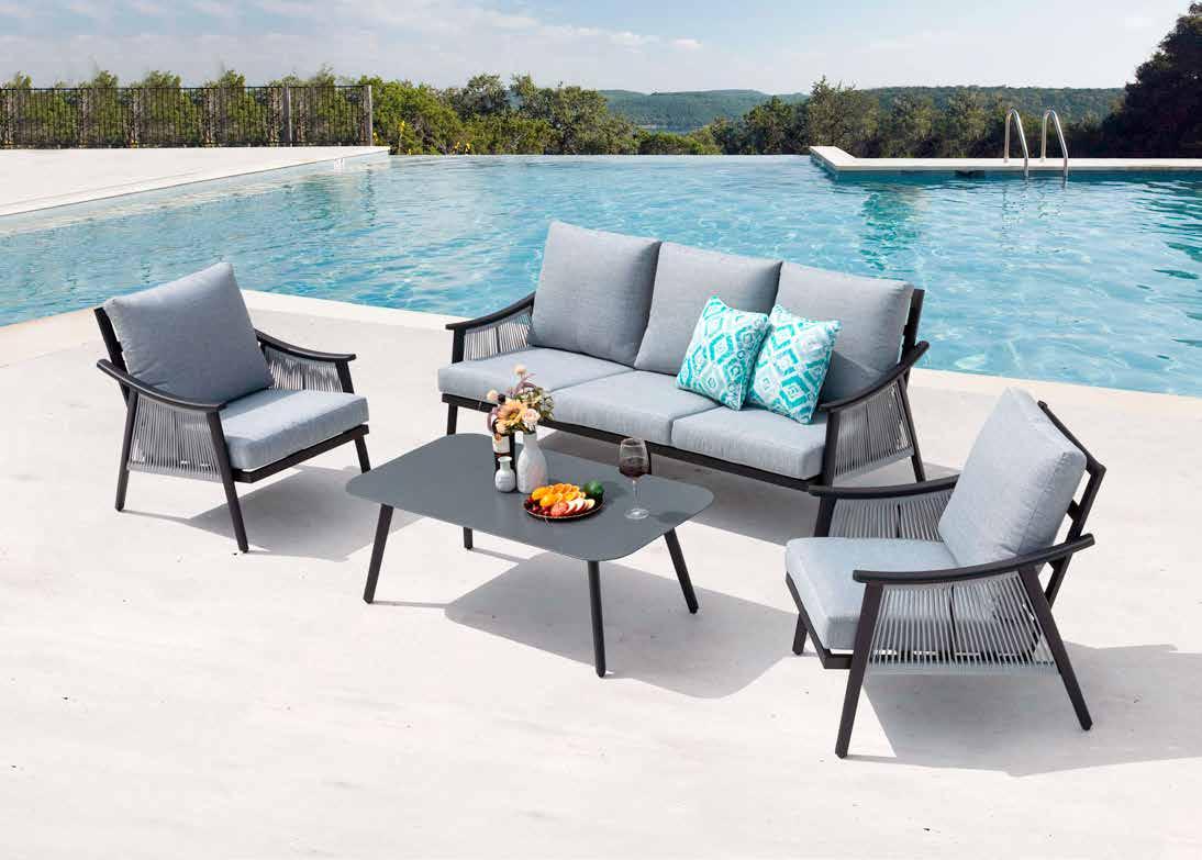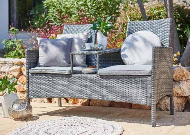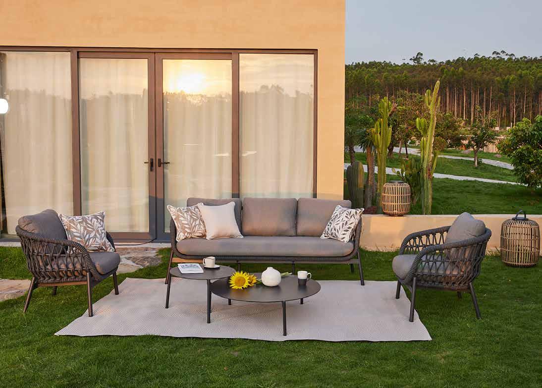 Lounge garnitura Melilla je atraktivno i funkcionalno rješenje za vaš vrt ili terasu, a „pletenim“ dizajnom bit ćete potpuno u trendu. Konstrukcija je od plastificiranog aluminija presvučenog u pleteni konop od poliesterskog vlakna. Sastoji se od trosjeda š/v/d: 200x74,5x74 cm nosivosti do 360 kg, dvosjeda š/v/d 126/74,5/74 cm nosivosti do 240 kg i stola š/v/d 100x66x100 cm nosivosti do 60 kg. Tamno sivi jastuci za sjedenje i naslon su uključeni u cijenu. Dekorativni jastuci uz nadoplatu. (06210005/09)