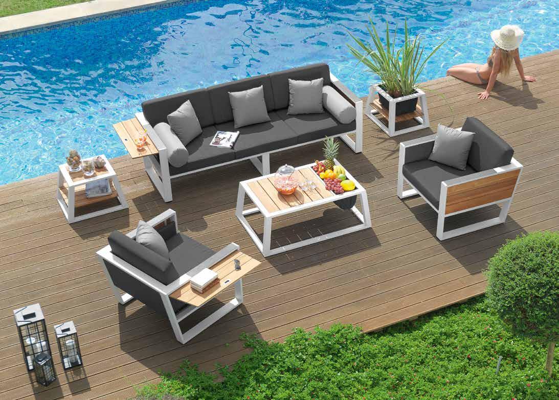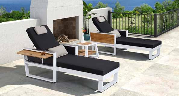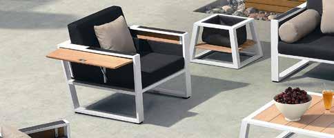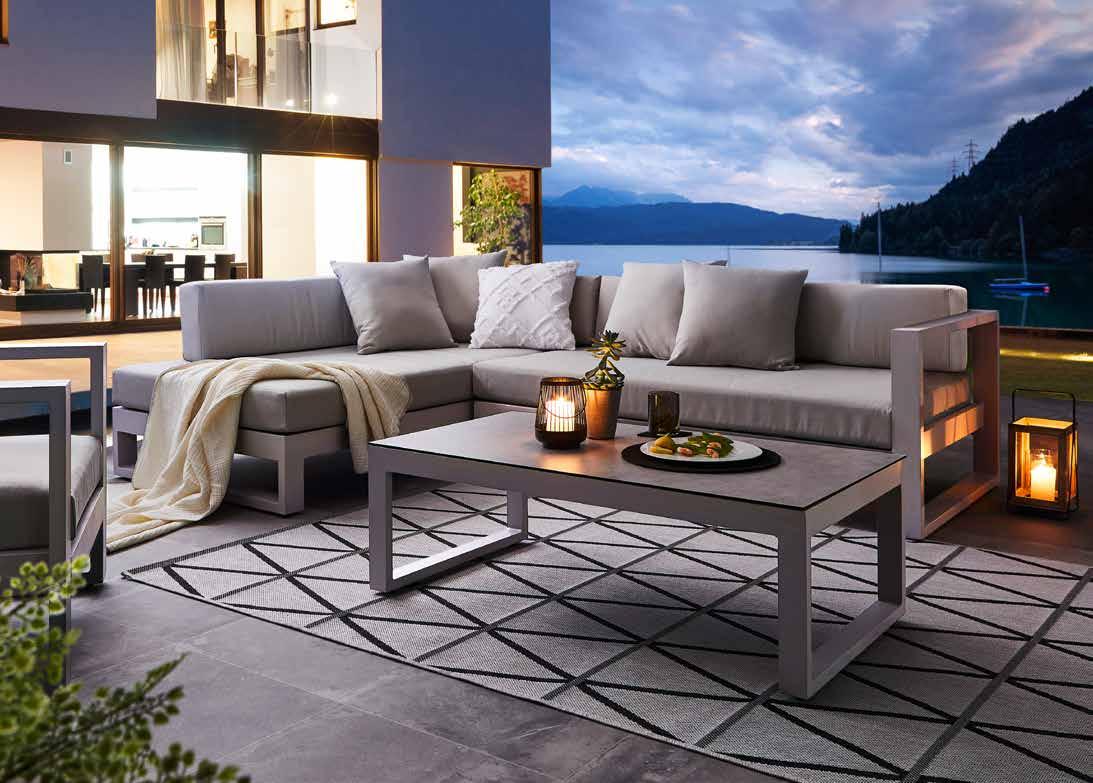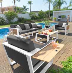 Luanda - poseban izgled za posebne užitke! Postojana i snažna aluminijska, geometrijska konstrukcija bijele boje u kontrastu je sa crnim sjedištem od tekstilen tkanine, postojanog na kiši. Strogoća garniture ublažena je sklopivim naslonima za ruke od pravog tikovog drva koji zgodno služe i kao pomoćni stolići. Trosjed š/v/d: 220x61x81,5 cm nosivost do 250 kg. Fotelja š/v/d: 84x61x81,5 cm, nosivosti do 150 kg. Jastuci za naslon, sjedenje i sivi dekorativni jastuci uključeni u cijenu. Stol š/v/d: 75x41x110 cm nosivost do 50 kg. Pomoćni stolić š/v/d: 50x41x60 cm, nosivosti do 30 kg. Održavanje: vlažno brisati, upotrebljavati sredstvo za održavanje drva, sušiti u hladovini, čistiti mekanom četkom. (29280008/02,07,08,13)