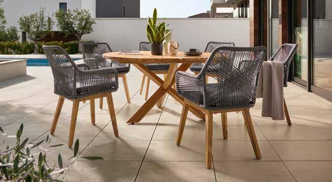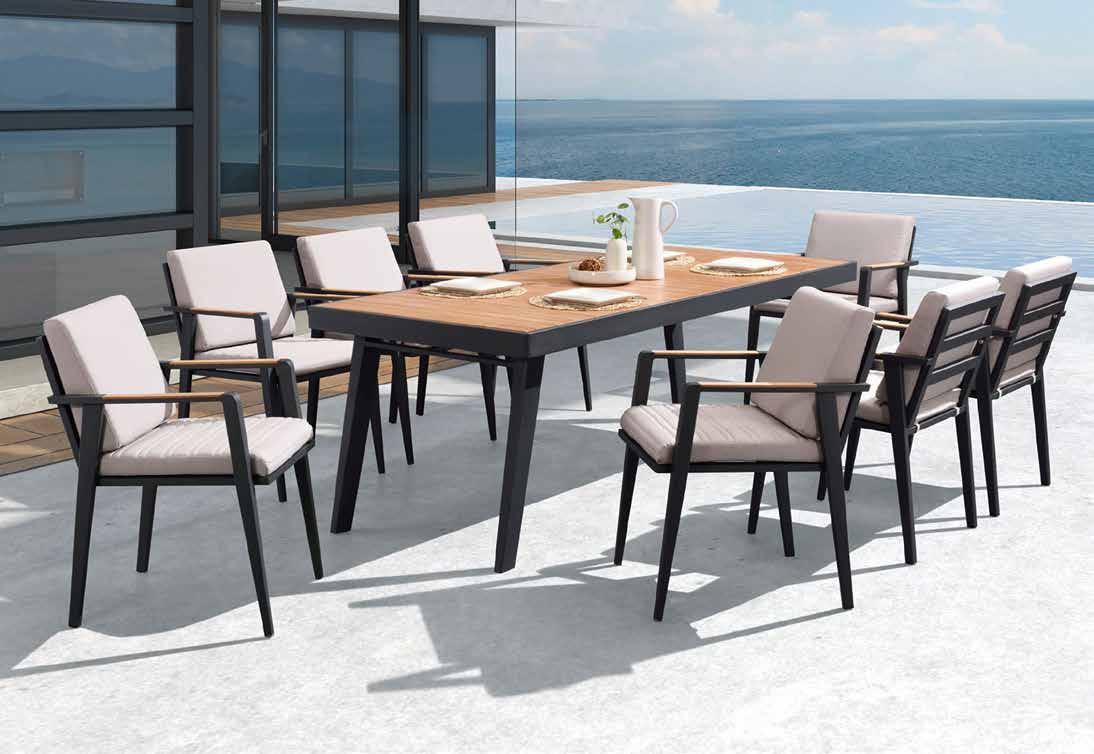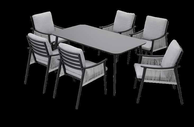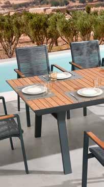 La Spezia - elegantna garnitura za vrhunsko uživanje. Konstrukcija garniture i nasloni stolica od plastificiranog aluminija mat antracit boje, a mekoću i profinjenost joj daje masivno tikovo drvo na površini stola te kao atraktivan detalj na rukonaslonima stolica. Sjedišta i nasloni stolica su izrađeni od pletenog užeta antracit boje. Stol š/v/d: 200x75x100 cm, nosivosti do 60 kg. Stolice š/v/d: 65x88,5x60 cm, nosivosti do 120 kg. (29280028/01,07)