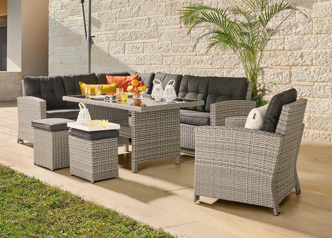 Garnitura Willis-O-Shop je idealan partner za onaj opuštajući osjećaj kada počne godišnji odmor. Konstrukcija je od aluminija svijetlo sive boje s jastucima za sjedenje i naslon uključenima u cijenu. Š/d kuta 180x248 cm, od toga je nosivost trosjeda i otomana pojedinačno do 360 kg. Stolić dolazi s kaljenim staklom, sitotisak otiska, š/v/d: 110x36x60 cm i nosivosti do 30 kg. Dekorativni jastučići uz nadoplatu. (07610021/09)