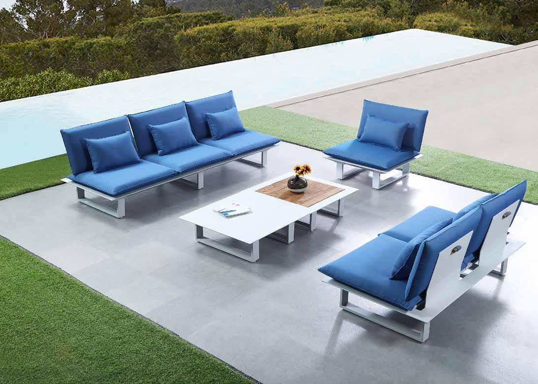 Samos je garnitura iznimnog izgleda koja će oplemeniti svaki prostor. Konstrukcija je od aluminija a sastoji se od trosjeda š/v/d: 249x67x83 cm, dvosjeda š/v/d: 166x67x83 cm, fotelje š/v/d: 83x67x83 cm i dva klub stolića š/v/d: 83x25x83 cm koje po potrebi možete spojiti ili odvojiti. Uz garnituru dostupna je i ležaljka s leđima podesivima u nekoliko pozicija, š/v/d: 198x86x83 cm. Plavi jastuci od olefinske tkanine su uključeni u cijenu. (07360001/01,02)