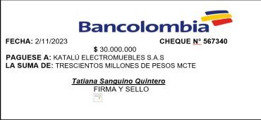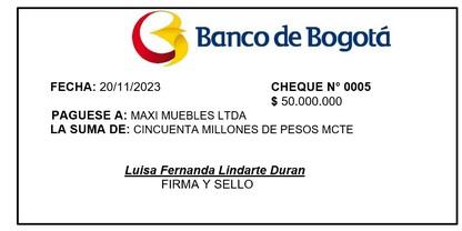 37 FECHA CODIGO CUENTA PARCIAL DEBE HABER 20-nov-23 2201 NACIONALES 50.000.000 220101.01 Maxi Muebles Ltda 50.000.000 1102 BANCOS 50.000.000 110201.01 Banco de Bogota 50.000.000 CODIGO DÉBITOS CREDITOS 2201 50.000.000 1102 50.000.000 CHEQUE No. 0005 EFECTIVO FIRMA Y SELLO DEL BENEFICIARIO BANCO. BOGOTA CUENTA No. 278956 SUCURSAL. OCAÑA PREPARADO REVISADO APROBADO CONTABILIZADO L.L S.A S.A L.L MAXIMUEBLES LTDA. C.C. N.I.T. 891.234.569-3 FECHA RECIBIDO: 20/11/2023 CONCEPTO NACIONALES BANCOS PAGADO A: MAXIMUEBLES LTDA. C.C./ N.I.T. 891.234.569-3 DIRECCIÓN: OCAÑA La suma de (en letras): CINCUENTA MILLONES DE PESOS MCTE Por concepto: ABONO A FACTURA 6750 KATALÚ ELECTROMUEBLES S.A.S. Nit. 985186301-0 COMPROBANTE DE EGRESO No. 006 CIUDAD: OCAÑA FECHA: 20/11/2023 Valor $ 50.000.000