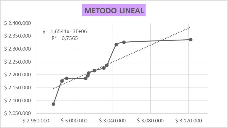 1427901.24728786 ln(x) − 17878760.7282178 R² = 0.79419657754982 METODO