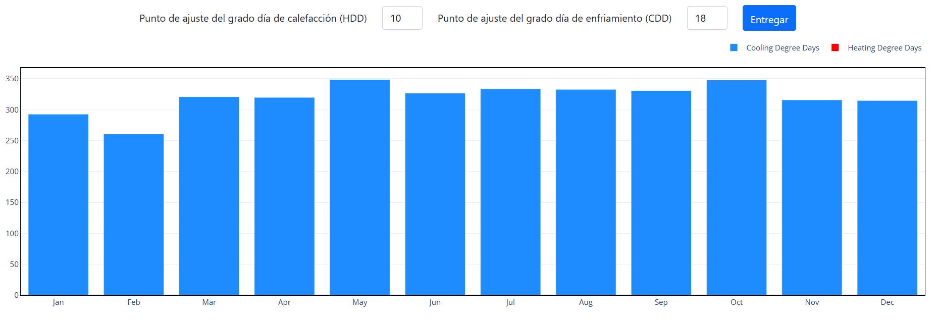 Los picos se dan en mayo y octubre (~350 CDD), indicando los meses más cálidos.