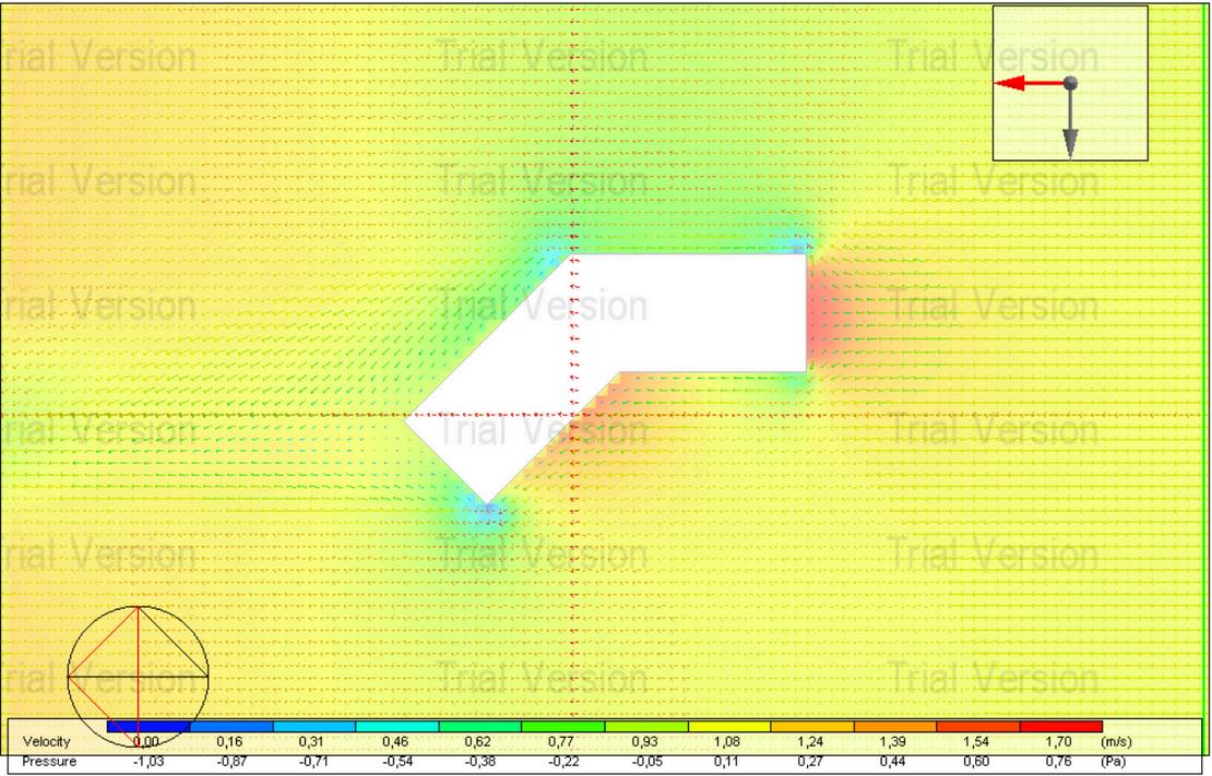 Se observan zonas de presión positiva en la fachada de barlovento (rojo) y presión negativa en sotavento (azul), lo que favorece la ventilación cruzada natural en el interior La velocidad del aire se mantiene moderada, ideal para un clima tropical húmedo donde se busca favorecer el movimiento del aire sin generar turbulencias excesivas.