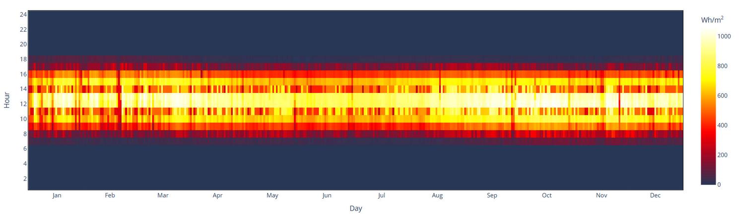 Radiación solar: Muy intensa en horas diurnas (picos cercanos a 1000 Wh/m²), generando alto potencial para energía solar y alta carga térmica