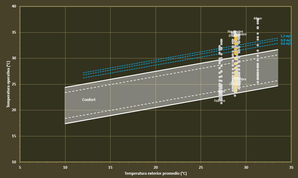 se muestra un clima cálido estable todo el año, con temperaturas medias entre 26 °C y 30 °C, casi siempre por encima del rango de confort adaptativo, lo que indica necesidad de estrategias de enfriamiento