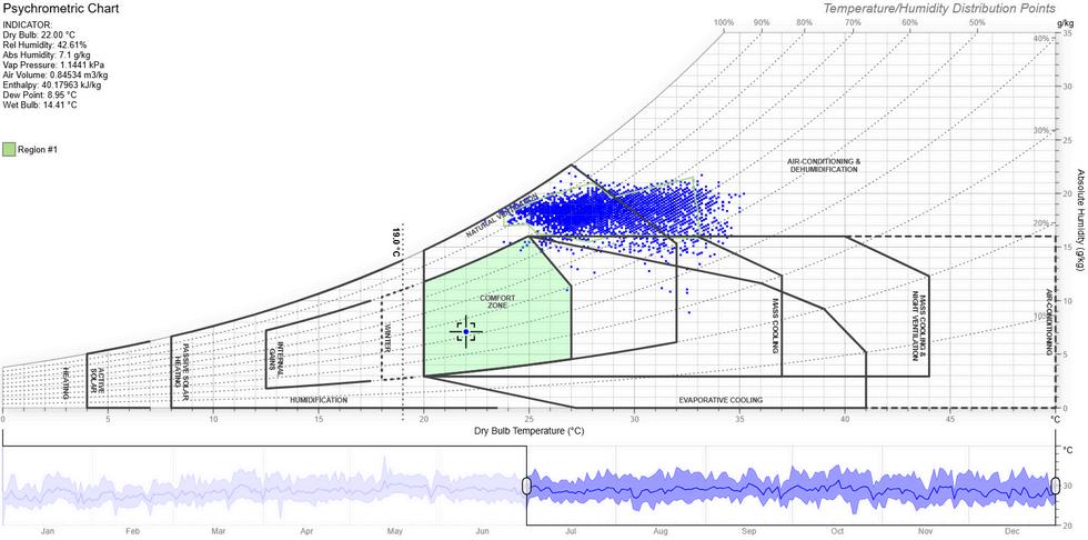 para una temperatura promedio anual de 28.6°C, las personas se sienten cómodas dentro del rango 23.1°C a 30.1°C, siendo la temperatura neutra 26.6°C.