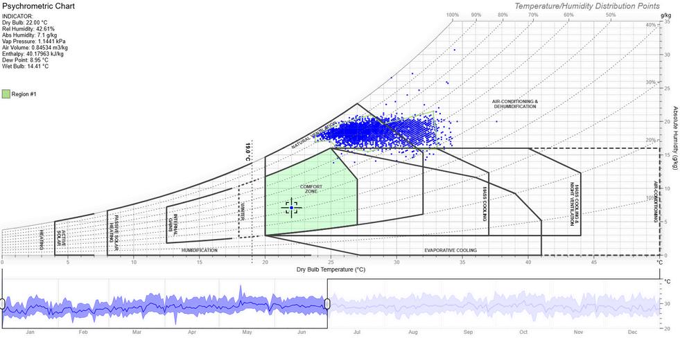Muchas horas están dentro de la zona de ventilación natural, pero fuera del confort térmico debido a la alta humedad.