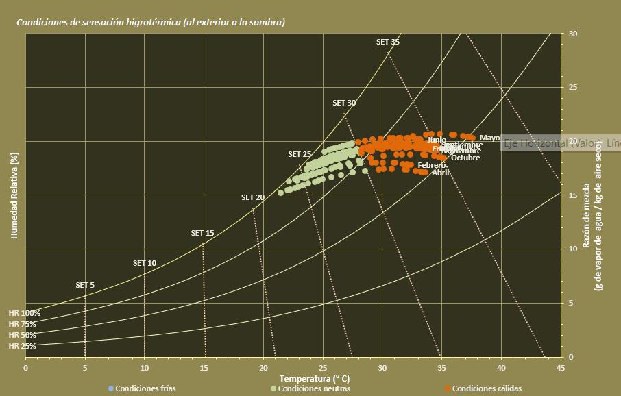 De mayo a noviembre, los valores superan la franja de confort → lo que confirma que gran parte del año es más caluroso de lo óptimo.