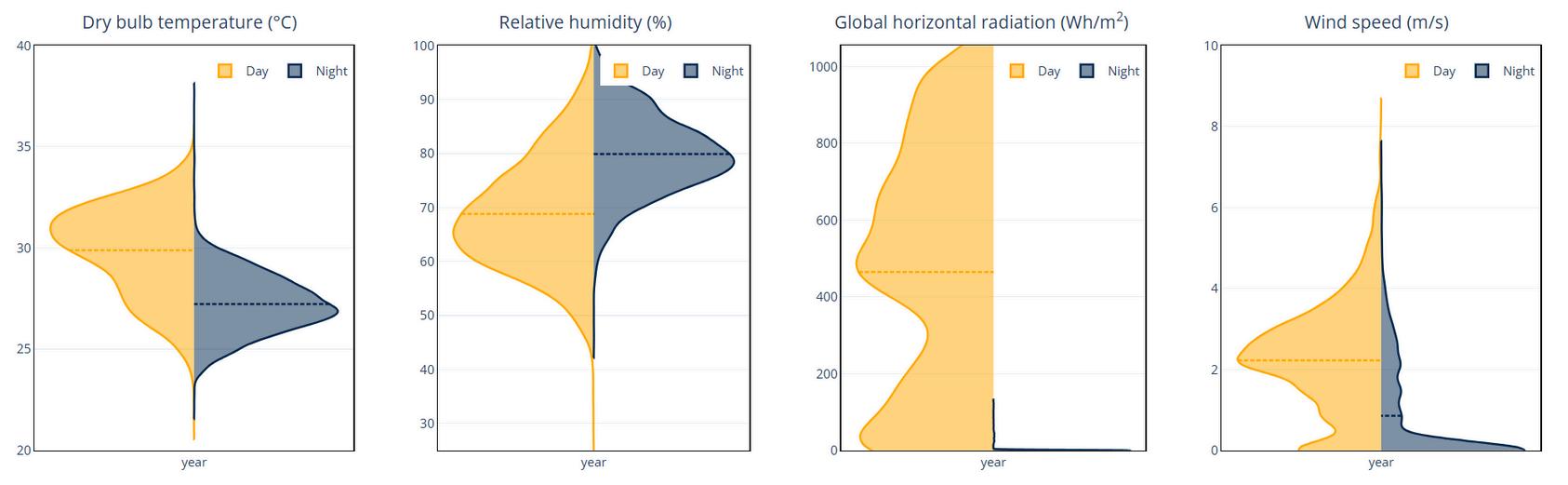 Temperatura: Alta todo el año, con mediana diurna ~30 °C y nocturna ~27 °C. Poca oscilación térmica diaria.