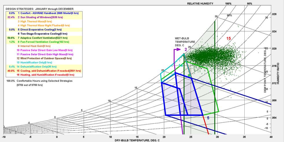 Muchas horas están dentro de la zona de ventilación natural, pero fuera del confort térmico debido a la alta humedad.