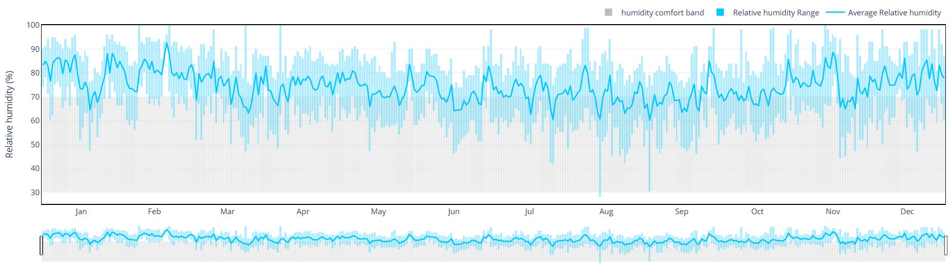 La humedad en el año es alta y estable, la mayoría del tiempo entre 70 % y 85 %, con picos cercanos al 90 % y ligeras bajas a mitad de año.