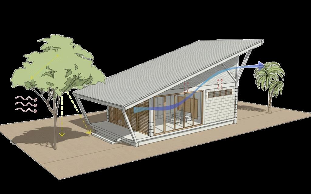 diseño bioclimático utilizando aislamientos, materiales reflectivos, sombreados, ventilación cruzada + masas térmicas.