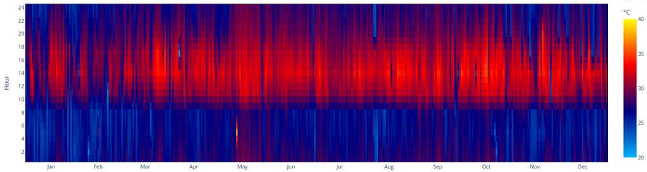 Las horas más cálidas se concentran entre las 12:00 y 18:00, alcanzando valores de 30 °C o más prácticamente todos los días del año.