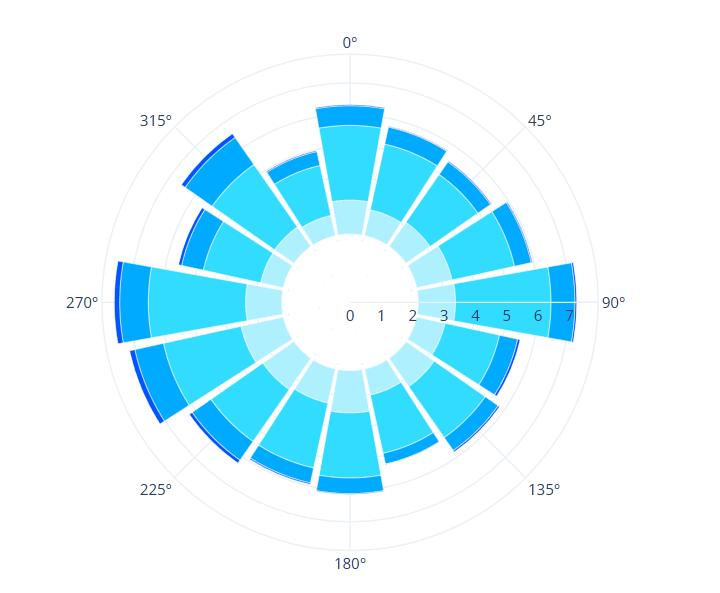 La mayoría de los vientos están entre 15 y 5.5 m/s (celeste medio y azul claro).
