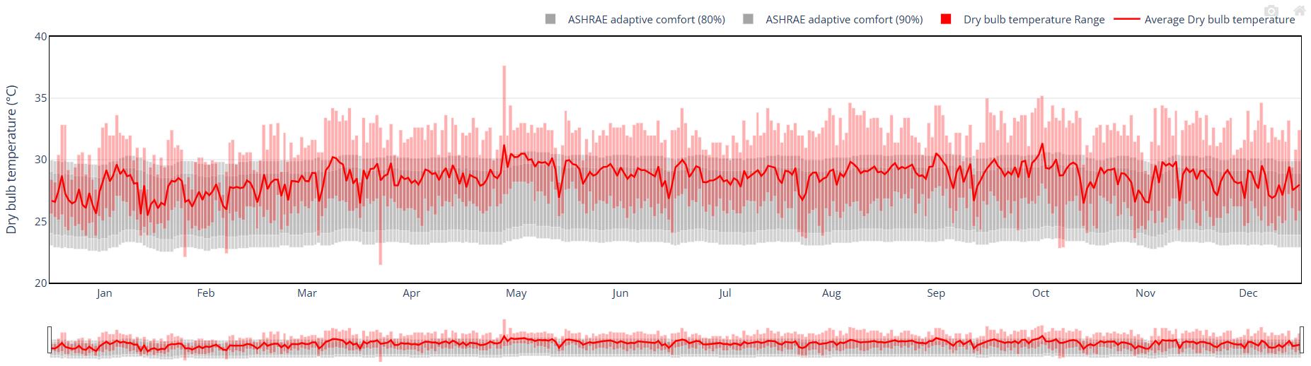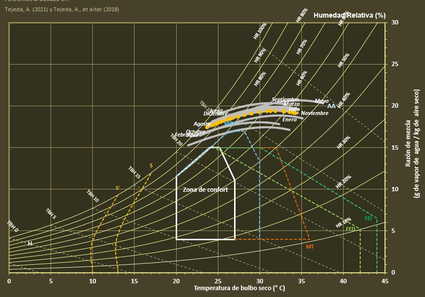 se muestra un clima cálido estable todo el año, con temperaturas medias entre 26 °C y 30 °C, casi siempre por encima del rango de confort adaptativo, lo que indica necesidad de estrategias de enfriamiento