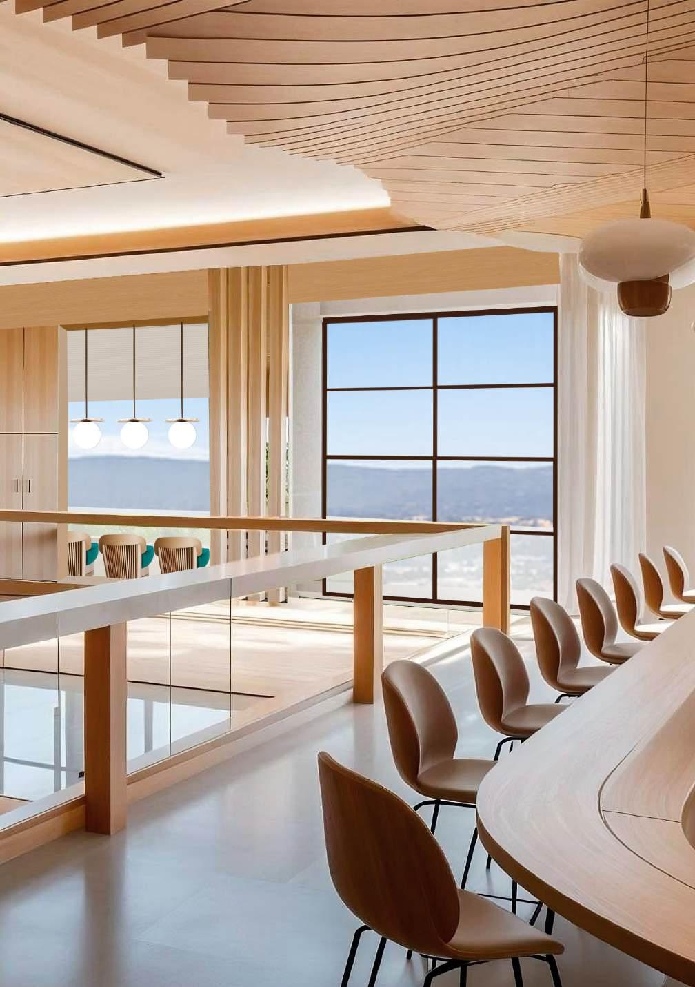 With organic shapes in furniture and décor, the thoughtful use of natural materials paired with advanced technologies, and the integration of Biosolar leaves with greenery through transparent partitions, the center creates a seamless connection between people and nature. It offers an environment that blends beauty, sustainability, and innovation, encouraging collaboration and a shared commitment to a greener future.