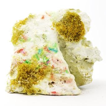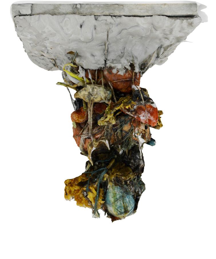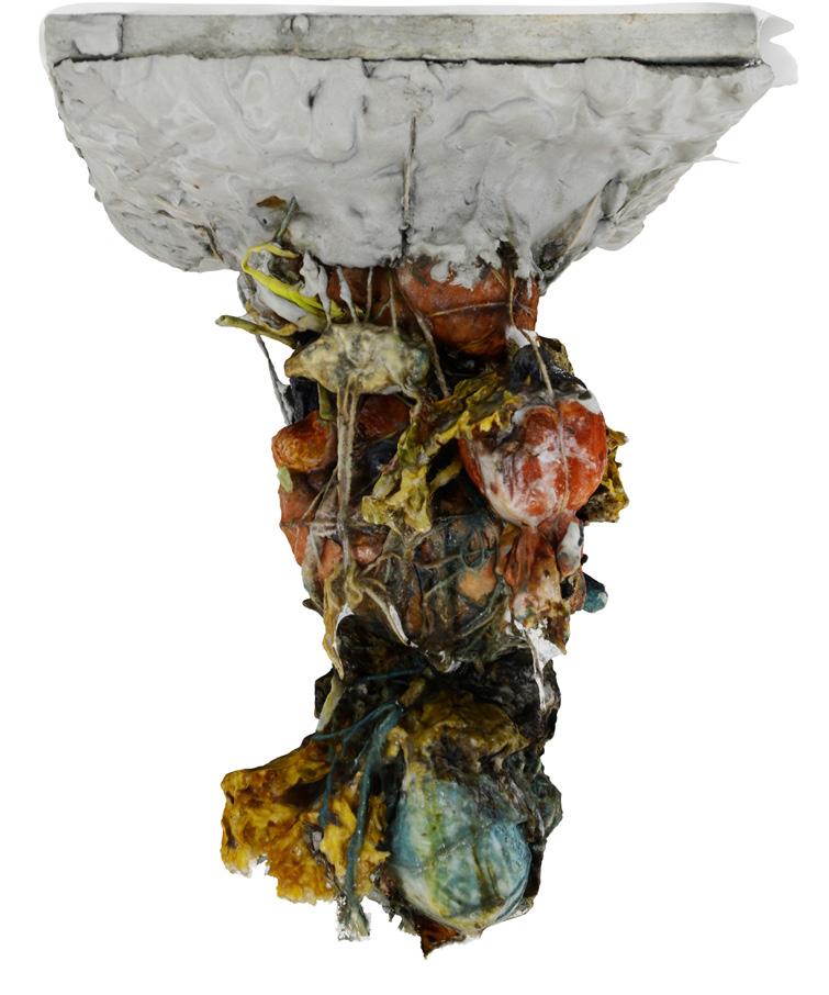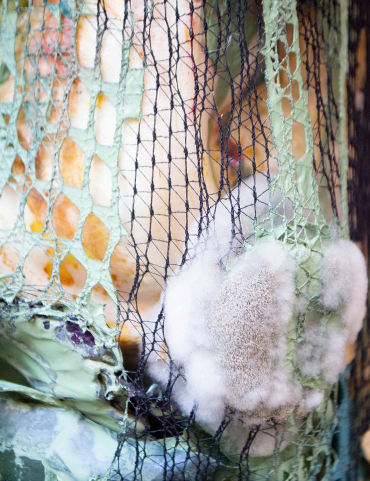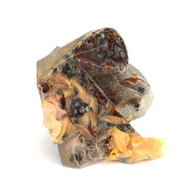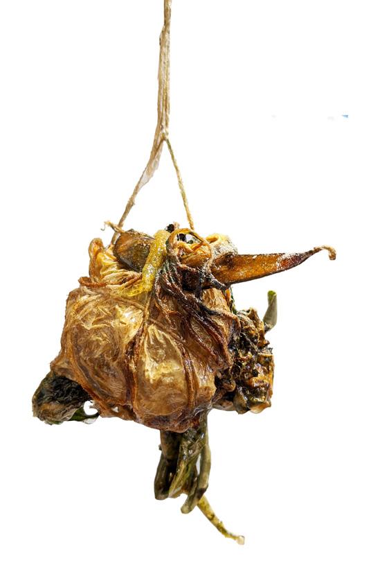 A homunculus was created wrapping organic objects in synthetic materials, obscuring artificial and natural through the blurring of growth and decay. As time passes the homunculus shrivels and changes, representing a breeding ground for new things.