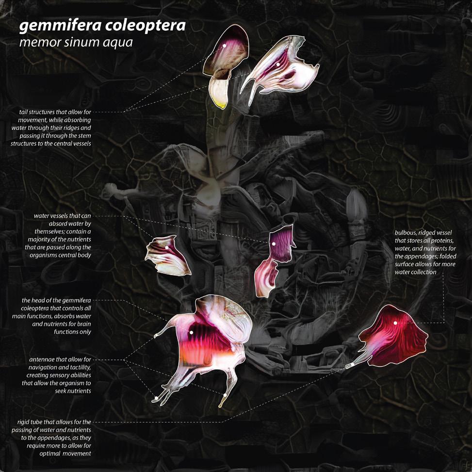 The analysis of the gemmifera coleoptera shows the breakdown of the specimen’s parts, and how these parts function harmoniously while giving the specimen certain capabilities that it has adapted over time within its new environment.