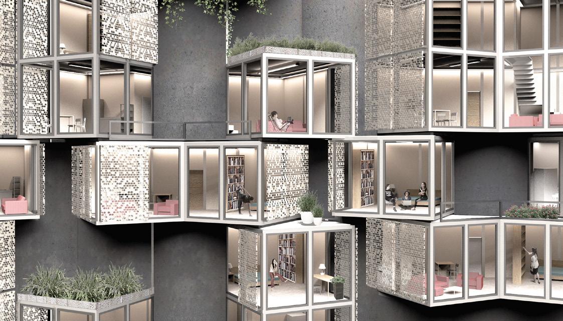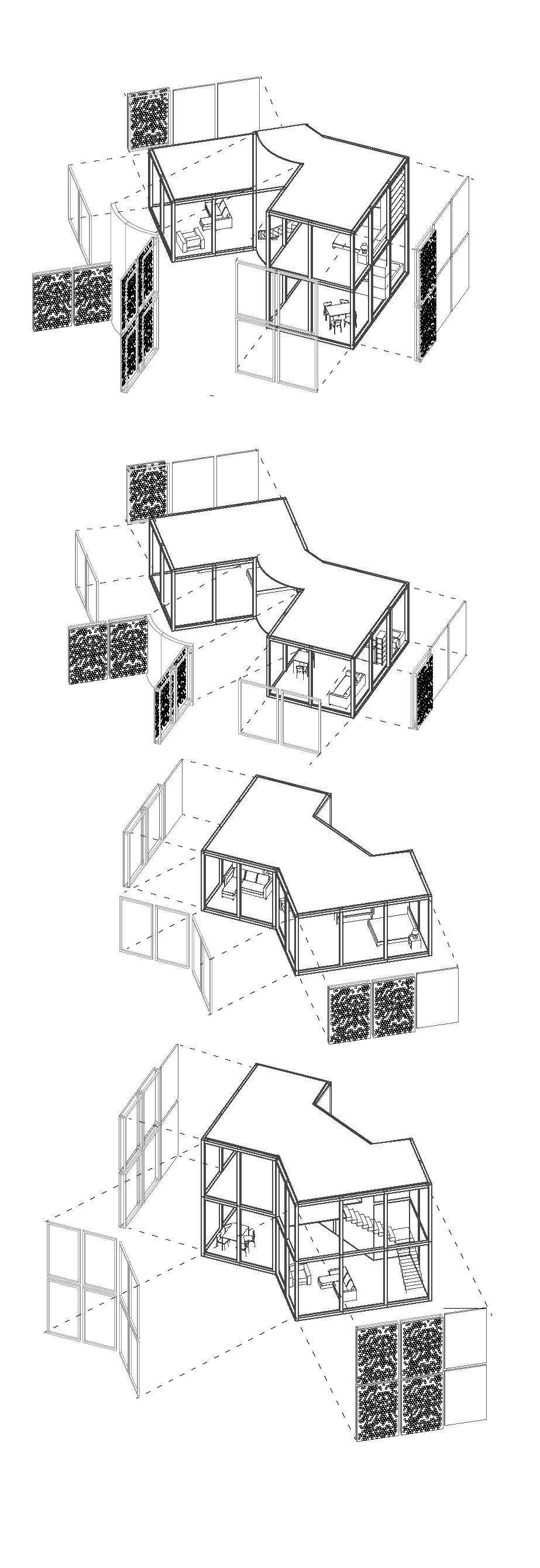 Typologies, a, aa, b and bb can be modified to fit the users needs, whether it’s living solo or expanding for a family. Clad with perforated metal panels ensure both filtered light in the apartments as well as screens for privacy from neighbors. The scaffold atrium cuts through the middle of the building, connecting shared spaces for activities and allowing passerby to casually view other activities. The internal spaces are constructed with white, powder-coated steel inset with translucent acrylic panels to create a distributed, flexible system with movable furniture for multiple programs and various activities.