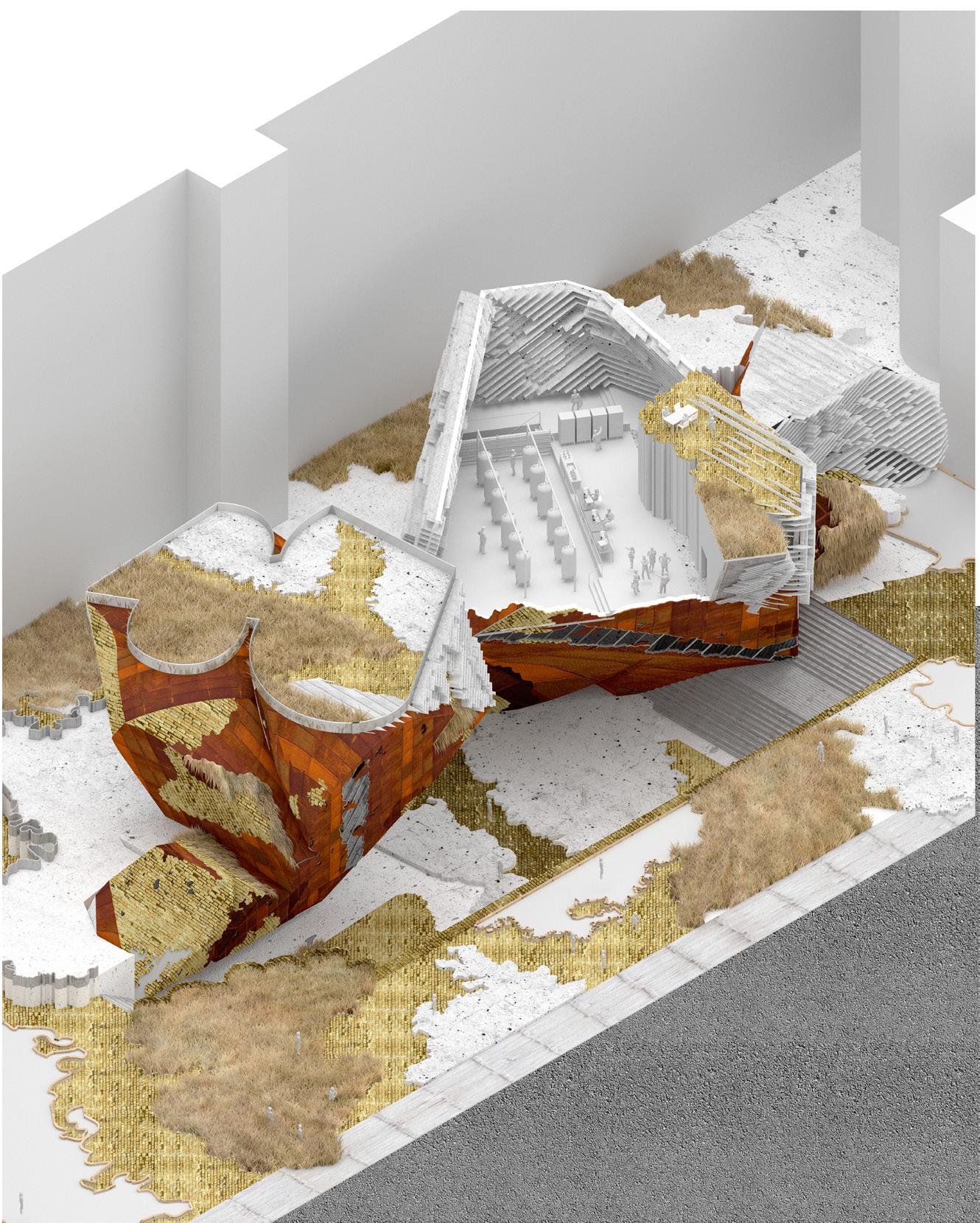 Fluctuating between images output by the AI neural networks and designing these new worlds, we explored this strange new territory of AI constructs and attempted to navigate the formal implications of its evocative imagery. Our architectural proposal is imagined to be composed of a thickened, keratin inner shell connecting areas of process, storage and non-human spaces. Artificial ground connects and obscures the relationship between the ground and strange new ecology.