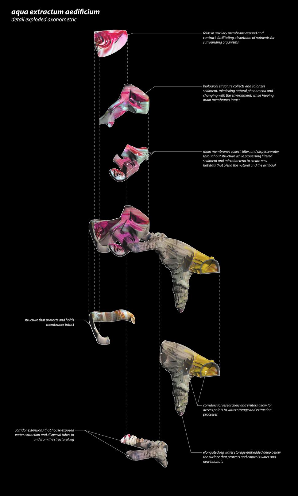 Some key features include a ridged vessel that captures and stores water vapor and filters sediment from the air. Colorizing microbacteria react to external stimulus and attract new organisms into the structure’s micro-ecology. A central core processes decay, absorbing nutrients as the structure sheds and releases unneeded elements. The artificial and natural are blurred, new grounds are made of familiar yet foreign materials in this environment. Sprouting new roots into this strange yet known place, this new hybrid of artificial natures adapts as it attempts to expand and survive.
