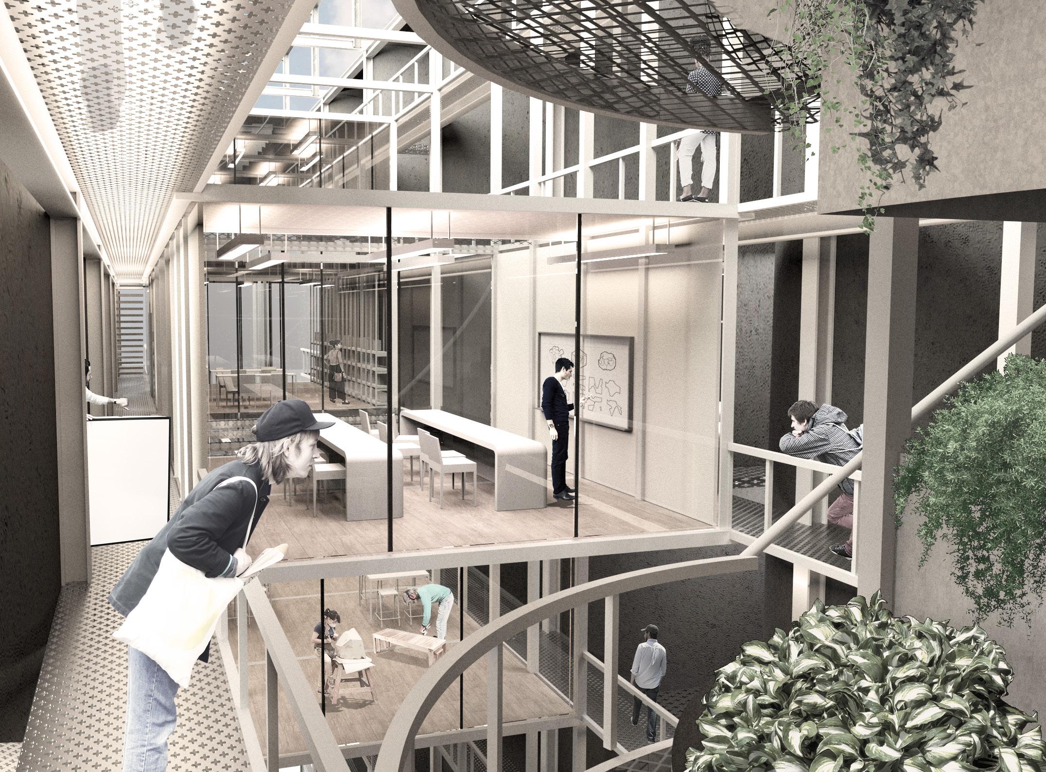 The atrium cuts through the middle of the building, creating pathways and views. The scaffold is a white powder-coated steel inset with translucent acrylic panels. The flexible system with movable furniture allows users to mold the space their preferred creative activity.