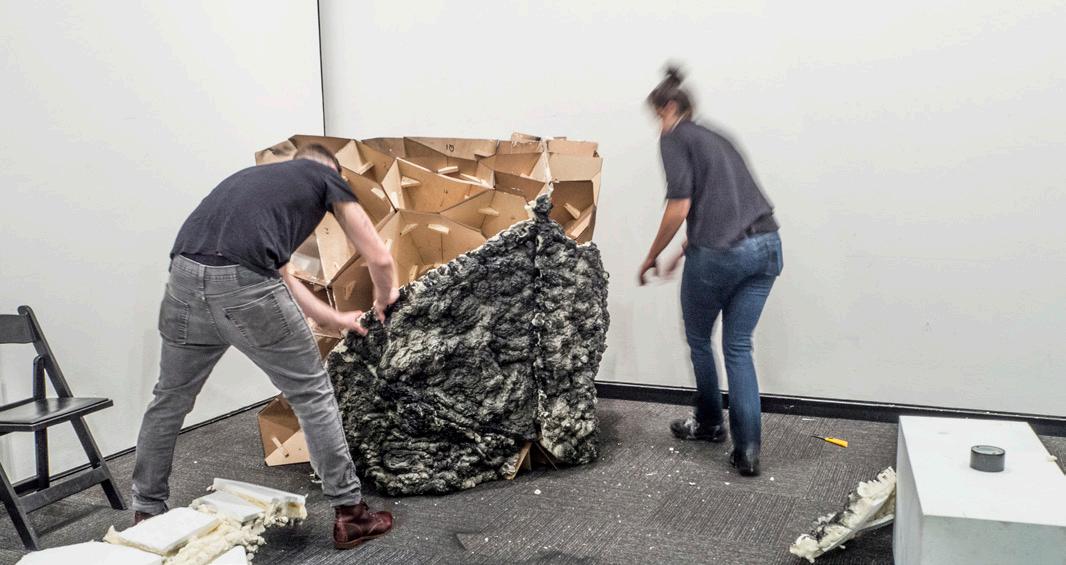 Fluctuating between digital form finding and physical iterations,we were interested in creating an object-animal that ‘lived’ in the museum. We experimented with the tension between foam as a cheap material and another external force acting upon it: fabric, paint, sand. Using metal cladding as the ‘hard’ to contrast the ‘soft’ of the foam further draws this tension, reflecting those that pass in a multi-faceted interior mirror. The viewer’s perception of the object shifts as they start far away, move closer, move around and within.