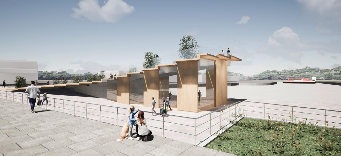 フェリーターミナル かんたん港園 かんたん港 至別府 広場と一体利用できる活動と出会いの場としてのターミナル 津波避難施設として利用者を守るターミナル 環境にやさしい省エネ計画/長寿命化/木質化 ステップルーフで自然光を取り入れた明るい艇庫 ホーバーの魅力を見て学べるピットイン広場 コストを抑え タ ミナル1階はホ バ 広場と 体的に利用できます。屋内外で十分なスペ スを確保し、日常的なくつろぎのスペ スと し、内部のイベント利用も可能な開かれた空間とします。海からの来訪者も陸からの利用者もみんなが利用でき、にぎわいを 感じてもらえる活動と出会いの場となります。ユニバ サルデザインを基本にバリアフリ で内外が繋がる空間とします。
