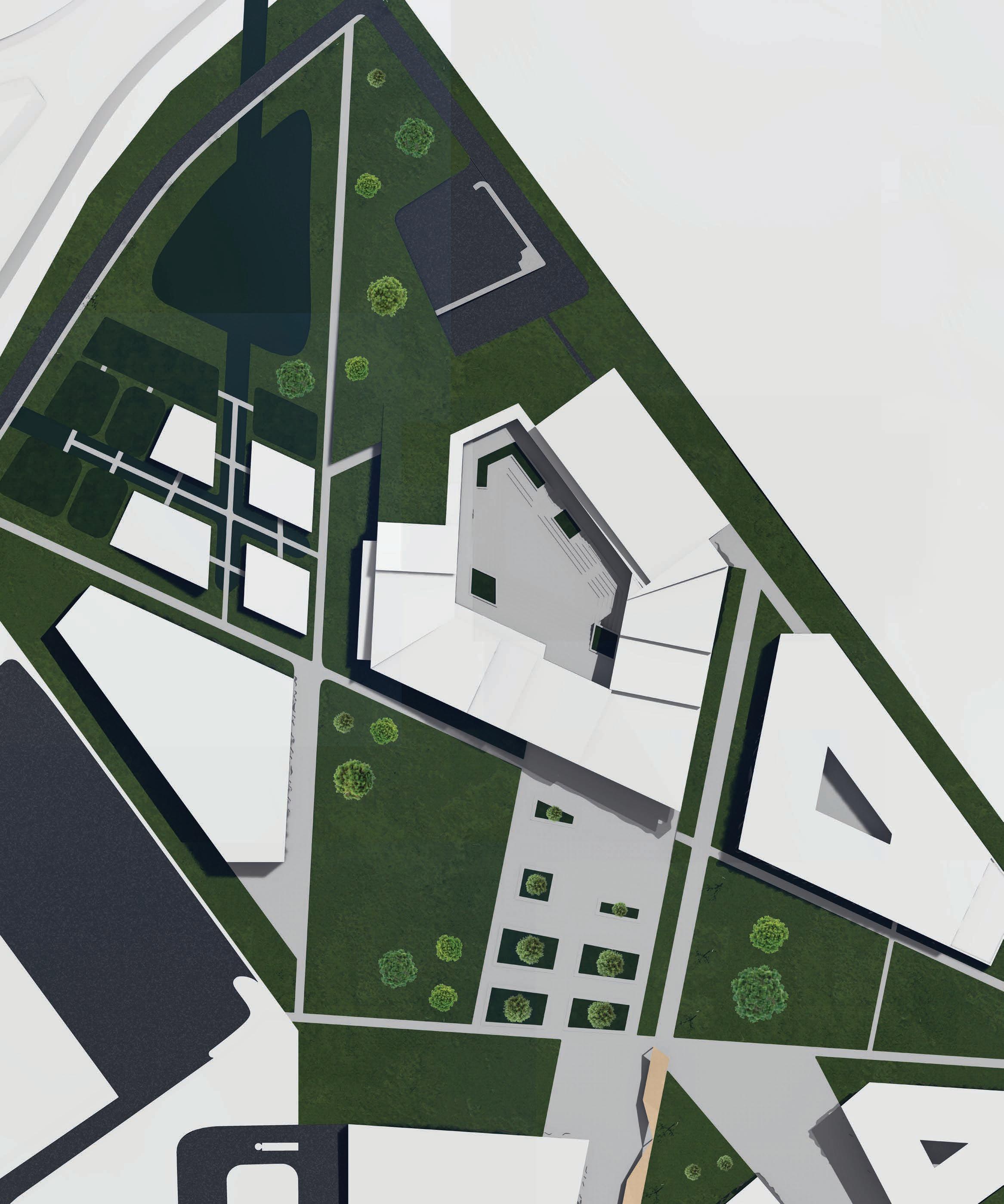 The first step was establishing our main path through the site and creating a start point and end point. From there, we divided the rest of the site to create smaller plots and designated two main green spaces. The building forms were created by the shape of these plots along with the interior courtyards. Along with creating interior spaces within the buildings, we wanted to create interior spaces between the buildings and furthered this visual connection using a veil that only occurred on the exterior walls facing the inside of the campus.