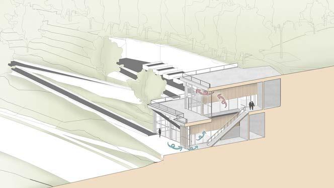 With the goal of connecting Rose Park and Rock Creek, this structure is built into the hill that was previously unused and acts as a barrier between the two parks. The structure uses its form to reach into the landscape and allow for reflective travel between the parks. Each level focuses on a certain aspect of healthy living: garden and food, community building, and individual growth.